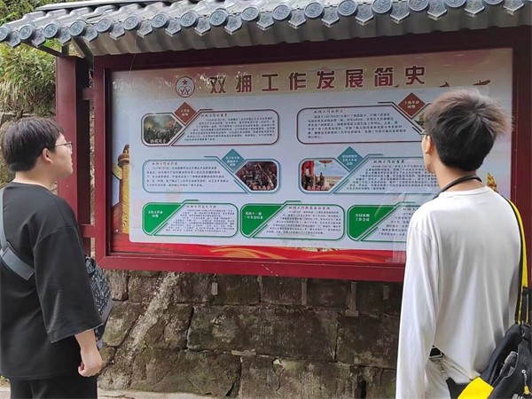 图为青“码”逐梦实践团成员在学习“双拥”政策 “路出双林外,亭窥万井中。江城孤照日,春谷远含风。”现在是上午十点,在红色的太阳的照耀下,老人在这里健体,孩童在这里嬉戏,一片安乐祥和。正是无数革命前辈前仆后继、断颅浴血,他们用鲜血和生命换来了如今的安宁和平,他们用忠诚和无悔展示了崇高的革命精神,他们用拼搏与奉献铸就了历史的荣光。“今日盛世,当为往日先烈之所愿。“ 风物长宜放眼量,今日之行让实践团成员看见,大家对学习革命精神、爱国精神的高涨热情,实践团成员相信未来必定充满希望,中华民族伟大复兴终将实现。