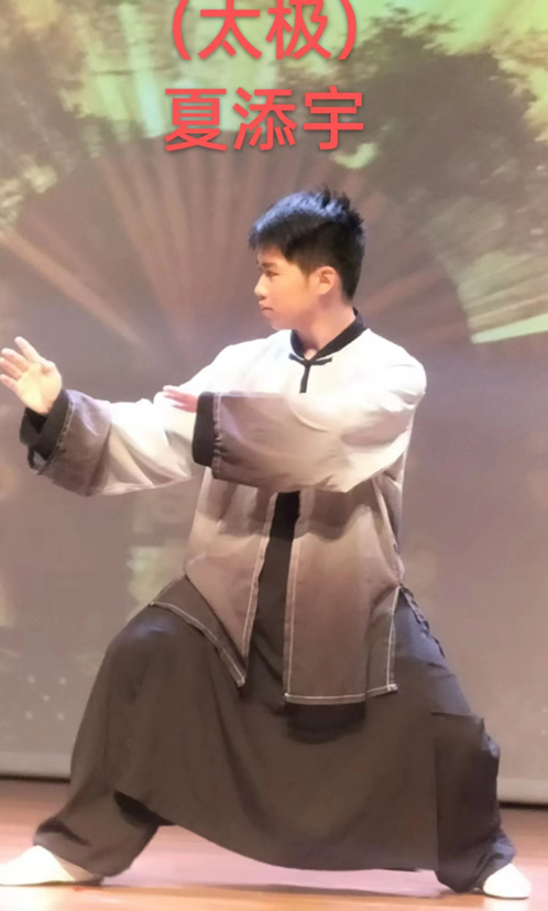 夏添宇同学是个英俊的小男生,受父亲影响,从小就喜爱武术、唱歌,但由于正处在变声期,对声乐演唱多少会有一些影响,于是张建东老师专门为他量身定制了一套太极《二十八》式,一招一式,柔中带刚,展示着中华少年的风采,得到了全体观众的一致好评。