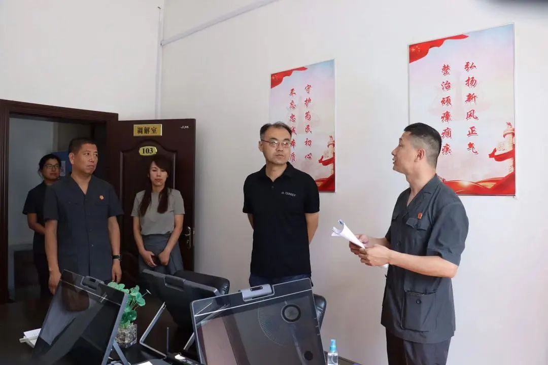 随后,在样子哨法庭庭长高俊德的带领下,调研组一行来到无讼示范村——太平沟村,通过村书记张晓光的介绍,详细了解法院服务乡村振兴、设置法律服务站、法官进网格等具体工作开展情况。