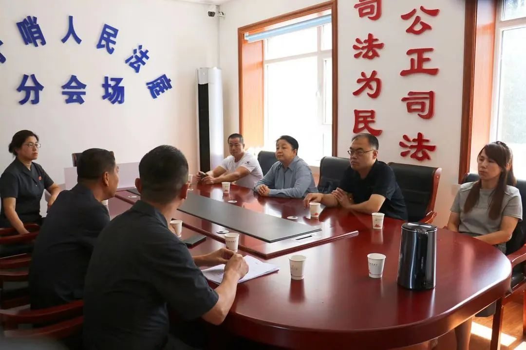 在样子哨人民法庭,调研组一行实地查看法庭办公环境,详细询问法庭的人员配备情况、收结案数量、诉前调解、调撤率等情况,在听取法庭关于“背包法庭”品牌建设及其他亮点工作情况汇报后,王林军主任对法庭工作成效给予充分肯定。