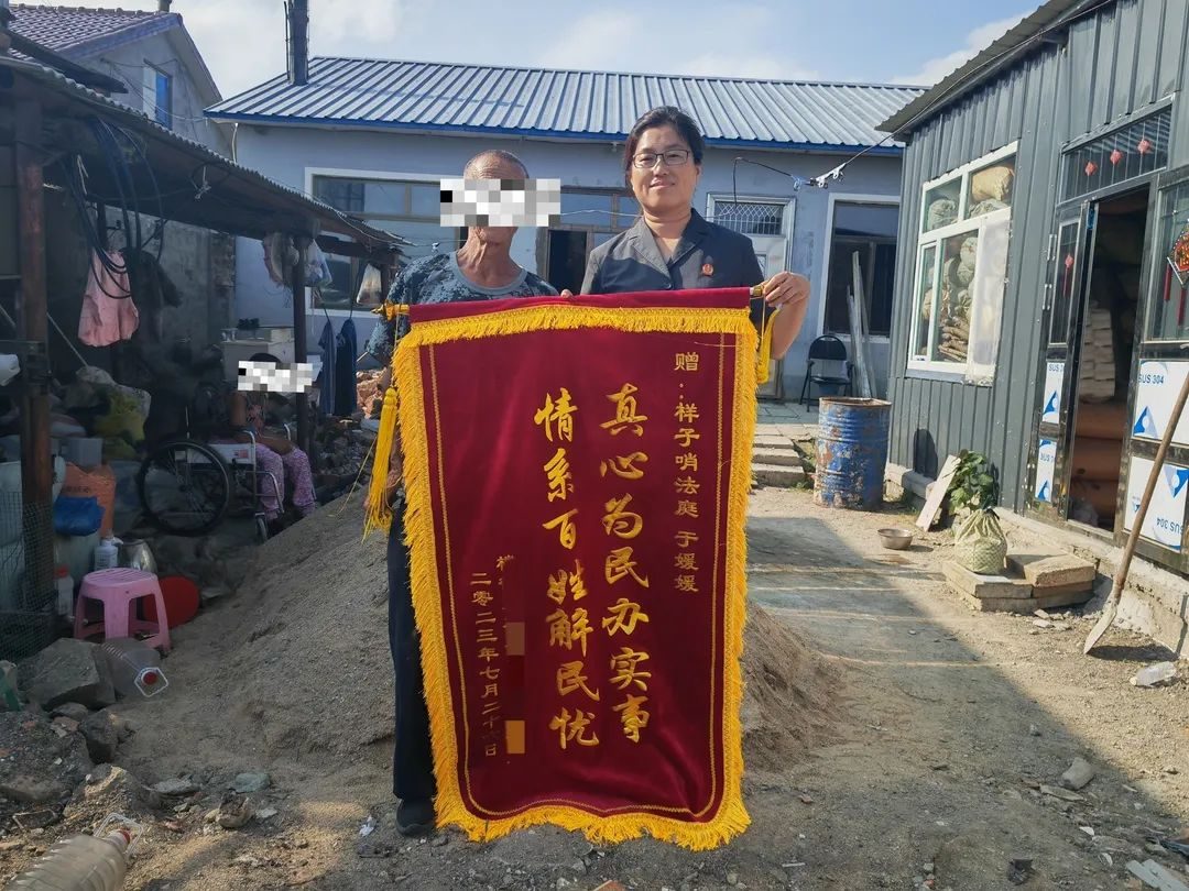 送达判决书的那天,法官第一次走进周大爷的家,家里不见周大爷的身影,询问了帮着照看杨大娘的周阿姨(周大爷妹妹)才知道,周大爷去镇上给杨大娘买夏天穿的薄衫了。法官在向杨大娘送达法院判决书的时候,因疾病丧失语言能力的杨大娘激动地落下眼泪,却不肯签收判决书,旁边的周阿姨解释说,杨大娘是太难过了,她觉得多少钱都换不回儿子的命。可是两个老人随着年纪增长,没了儿子的照顾,将来的生活怎么维持。法官劝慰了杨大娘,也在思考除了一份公正的判决,作为司法工作者的我们还能为这样的失独家庭弱势群体做哪些工作。 几日后,法官通过电话联系上周大爷,询问判决生效后赔偿款项是否到位。又不停的嘱咐他要好好照顾自己和老伴的身体,也说了一些日后生活需要注意的事情,而正是这些叮嘱似乎将周大爷心中的郁结化开了一些。 眼见这天不能下雨,一直惦念老两口的法官趁着“背包”法庭下乡走访时,再次登门,周大爷家里正在修理院子,大娘在旁边的轮椅上晒太阳,通过与周大爷进一步交流,法官发现这个发生巨变的小家在找寻一段新生。 “闺女,你当时电话里叮嘱我的话就好像我自己的孩子一样,真是暖了我的心,本来想把锦旗送到庭里,今天你们正好赶过来,真的谢谢你!” “大爷,我特别理解你们,以后有什么问题情况随时联系我......”收下周大爷送来的锦旗,法官心理感受到这位退伍老兵的感激与沉甸甸的爱意。
