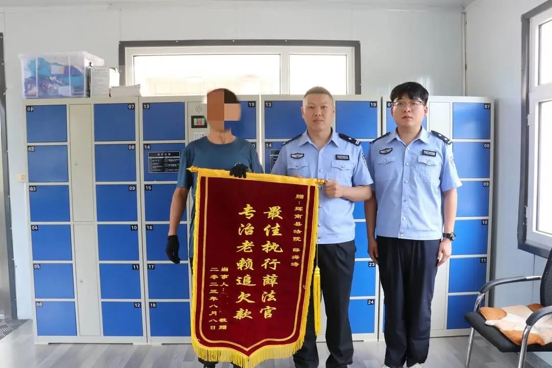 为民执行不畏难,百姓满意送锦旗“感谢薛法官的尽职尽责,一直为我的事情忙碌奔波,就以这面锦旗表达一下我的感激之情”。 近日,辉南县人民法院执行局副局长薛海涛收到了申请执行人王某送来的锦旗,感谢薛法官在执行案件中的尽职尽责,解决了自己的燃眉之急,保护了自身的合法权益。 2021年,被告陈某因急需用钱向原告王某借款25000元,双方约定还款时间,王某自觉二人系多年交情的好友,认为不会因为还钱的问题出现矛盾,可到了还款日期后,陈某一直不提还钱事宜,王某顾及多年交情并未催要。但因王某生活中遇到困难,急需用钱,所以王某通过多种方式,多次联系陈某还款,陈某以各种理由拒不还款,无奈,面对急需解决的现实问题,王某向辉南县人民法院提请诉讼。经法院判决,被告陈某需在规定期限内偿还原告王某25000元欠款。虽然判决生效,但陈某仍不按判决履行义务,为了尽快拿到欠款,王某向辉南县人民法院执行局申请强制执行。 执行法官薛海涛收到申请后,案件进入执行程序,薛法官依法对被执行人陈某的财产情况进行了网络和线下查控,但未查控到被执行人陈某有可以执行的财产,且被执行人陈某下落不明,没有音讯,薛法官将执行情况告知了申请人王某,并暂时终结本次执行程序。虽然终结本案执行程序,但是申请人的债权并没有实现,薛法官一直积极帮助申请人查找被执行人的财产,2023年5月,发现被执行人陈某刚刚退休,有退休工资可以执行,遂立即赶赴通化,冻结了被执行人的账户,扣划了部分存款,维护了申请人的合法债权。收到钱的王某激动的向薛法官表示感谢:“我本以为需要等很久,没想到这么快就拿到了欠款,太感谢薛法官了,时刻把百姓的事情放在心上。” 执行案件无大小,只为百姓开心颜。辉南县人民法院执行局将百姓利益放在第一位,采用灵活多元的执行方式,不断提升案件执结效率,加速兑现群众胜诉权益,保障群众合法利益, 努力让人民群众在每一个司法案件中感受到公平正义。