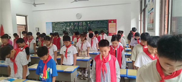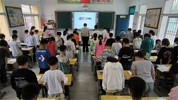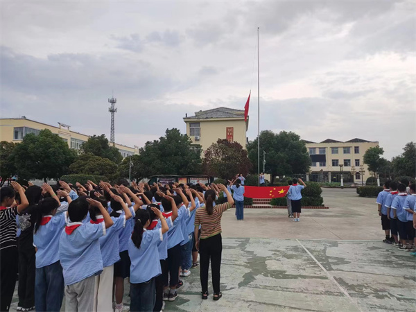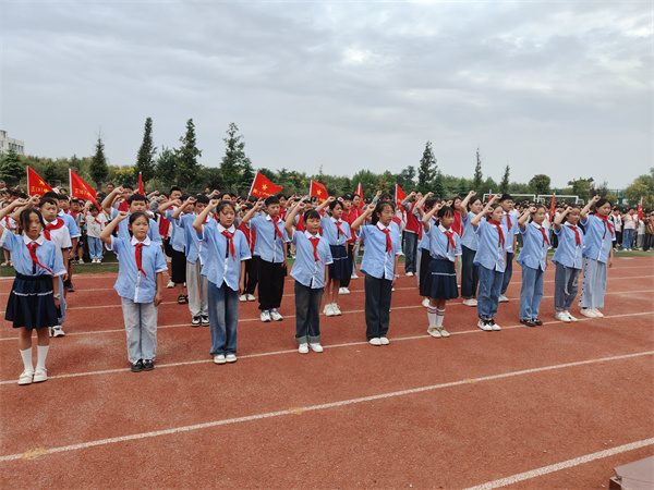上午10时整,“升国旗,唱国歌”!随着《义勇军进行曲》奏响,五星红旗冉冉升起,一声敬礼,全体少新队员行队礼,在庄严肃穆的气氛中共同回忆历史,缅怀先烈,少先队员胡小盼在国旗下讲话中号召全体少先队员要铭记历史,勿忘国耻,做勇于担当的新时代少年,全体同学举起右拳庄严宣誓,顿时“铭记历史,勿忘国耻;缅怀先烈,珍爱和平;热爱祖国,振兴中华;请党放心,强国有我。”的宣誓声响彻整个校园,爱国情怀在同学们的心中再次激荡。