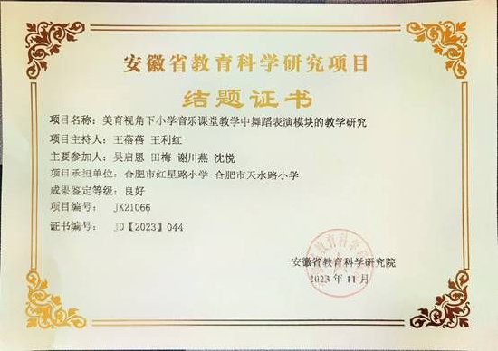 合肥市红星路小学省级教育科学研究课题顺利结题历经两年的共同努力,安徽省教育科学研究院组织专家评审、安徽省教育厅审批由合肥市红星路小学、合肥市王蓓蓓名师工作室与合肥市天水路小学、合肥市王利红名师工作室共同申报的省级课题《美育视角下小学音乐课堂教学中舞蹈表演模块的教学研究》于2023年11月正式结题,并获得“良好”等次。 ![]() 此次课题紧密结合了在小学音乐教学中进行舞蹈表演,培养学生的欣赏美、鉴赏美、创造美的能力;通过进行小学音乐课堂教学中舞蹈表演内容及教学方法的研究,让音乐教师在舞蹈表演中有内容可依,有章法可循,切实提高课堂教学效率及创新课堂教学方法;充分发挥学生的想象力,让学生自由的感受音乐,表现音乐。课题组成员在两问主持人的带领下,扎实推进课题研究进程,积极查阅资料,深入学习相关内容,广泛开展问卷调查、案例研究、教研分享、网络推送、论文、专著发表,并最终取得了丰硕成果。其主要成果有:形成七个教学范式;经典原创课例12节;教师原创桌面舞13件;学生原创桌面舞13节; 撰写论文10篇,其中,已发表论文3篇,论文获奖5篇;获得全省中小学作业设计大赛初中音乐学科一等奖;课题主持人王蓓蓓出版专著《走进有趣的音乐课堂》,其中第二章 婀娜多姿之舞动课堂,撰写舞蹈模块的教学实录及思考,为一线教师提供教学参考。该课题的研究不仅对舞蹈教学理念有了更深的理解,也对于提升教师课堂教学水平和实践能力也起到了推动和辐射作用。让广大音乐教师在今后的课堂教学中有法可用,通过不断学习和探究,打造优质课堂。 课题的成功结题离不开各级领导专家的关心支持,安徽省音乐教研员余含老师、合肥市音乐教研员蒋婷婷老师、庐阳区音乐教研员吴启恩主任、刘双宁老师在课题的研究过程中把握方向,为课题打下坚实的理论基础;合肥师范学院音乐学院院长李劲松教授、安徽师范大学音乐学院涂经伟副教授的给予课题组理论引领;合肥市红星路小学方业菊校长多次参与课题研讨活动,并对课题研究提出可行性建议;当然课题的成功结题更离不开全体课题组成员和工作室成员的积极努力。今后,我们还将再接再厉,借助合肥市红星路小学、合肥市王蓓蓓小学音乐教育名师工作室等优秀的平台,虚心学习,借鉴名师经验,扎实做好课题研究每一步,争取产出更多的教育研究成果,为工作室争光添彩,为合肥市小学音乐教育教育多做一份贡献!(沈悦) |