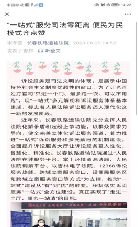 (图为:长铁法院跨域立案宣传文章及视频) 下一步,长铁法院将继续深化跨域诉讼服务改革以“如我在诉”的意识推进完善社会治理体系的具体实践,继续齐心协力,积极稳妥推进跨域诉讼服务工作,确保按期实现主要诉讼事项异地可办、全国通办,切实解决好异地诉讼难题,打通司法服务人民群众的“最后一公里”。