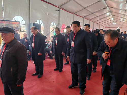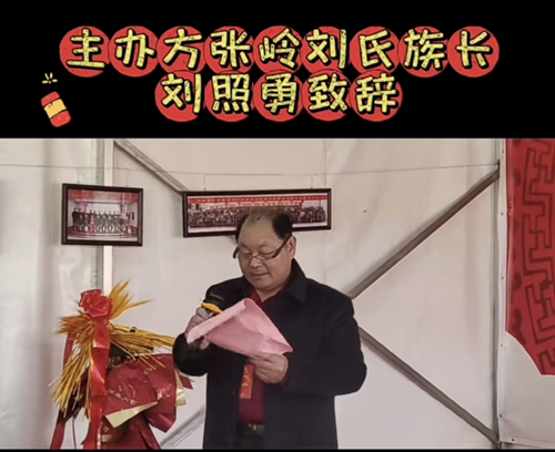 在一片欢乐声中,美丽大方的主持人韩璐女士,宣布团拜会开幕,与会全体起立,齐唱“没有共产党就没有新中国”,伴随着激昂热切的旋律,大家的心灵受到启迪和洗礼,彰显刘氏家族对囯家的无限忠诚与深厚情感。随后,由山东省济宁市嘉祥疃里大刘江公后裔族长刘德春讲话;主办方山东省枣庄市薛城区邹坞镇张岭刘氏族长刘照勇发表致辞并宣读贺电。在庄严的乐曲声中,刘氏世系(长幼辈分)举行了拜谱仪式。