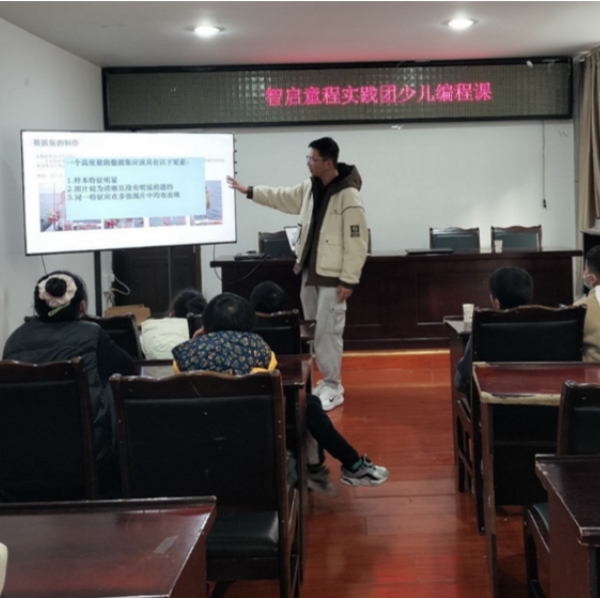 图 2图为志愿者王胤丞讲解人工智能及编程相关知识 “老师,机器人是怎么看到东西的?” “老师,AI是怎么分辨出红豆和绿豆的呢?” “老师,为什么我这样‘组装’代码运行不成功呢?” 在这个好奇心最重的年纪,孩子们总是能不断提出各种问题,对此,支教团成员喜闻乐见,结合每个小朋友的年龄,进行相对应的解答和引导。从简单的Scratch小游戏出发,细致讲解代码组成、模块使用、编程思维等,让学生有了从疑问“什么是编程?”到感慨“编程好有趣!”的转变。支教团以学科知识整合、生活经验整合、学习者中心整合为取向,坚持项目导向,基于具体项目实施课程,以问题解决和培养学生核心素养、创新精神和实践能力为目标,为实施国家战略培养创新人才贡献了自己的力量。 考虑到部分小朋友年龄较小,团队特意安排成员在实践课上手把手协助小朋友们操作。“虽然每天活动结束后都很累,但看到小朋友们灿烂的笑容也就值了。尤其是看到小朋友们求知的眼神,我恨不得把我知道的全告诉他们。”支教团成员陈禹函在课后总结时说道。