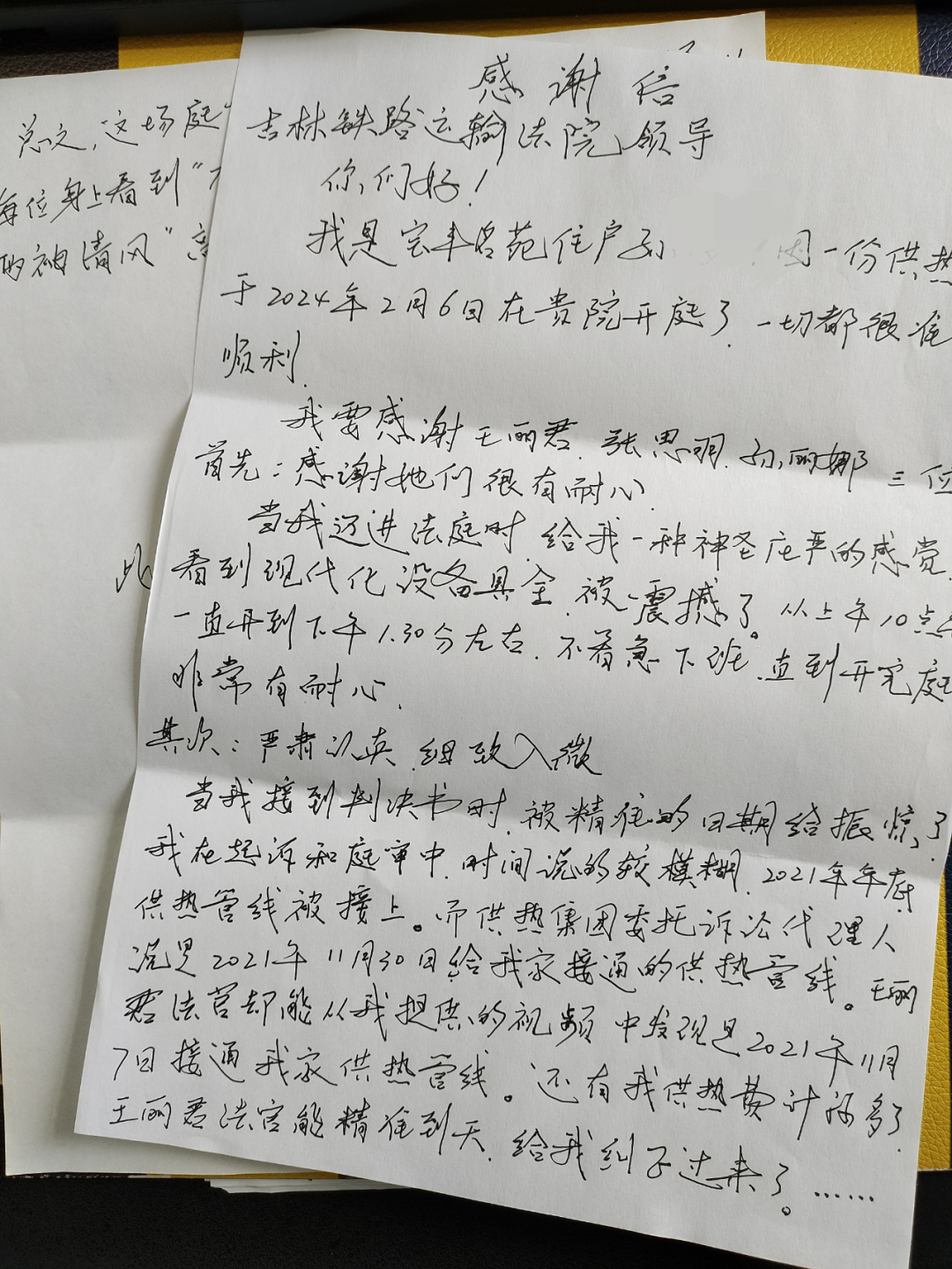 原告孙某每年均按时向供热公司缴纳供热费,某一日,因家中供热管线漏水,找到供热公司维修方才发现供热管线早已被截断。因孙某无子女在身边,自身也不懂法,遇到问题只能反复与供热公司协商,反复沟通,多年未果,无奈诉至法院。承办法官在了解案情后,先后联系供热公司和孙某,询问纠纷起因及案涉房屋现状情况。在开庭过程中,结合各方当事人的举证、质证,承办法官围绕案件争议焦点,依次发问,案件事实逐渐清晰,最终以判决的形式依法维护了居民住户的合法权益。 锦旗虽轻,意义千钧。多年来,吉铁法院始终秉持群众利益无小事的理念,努力办好每一个案件,让人民群众切实感受到公平正义就在身边。今后,吉铁法院将继续主动担当作为,以坚定、坚实、坚韧的步伐,充分发挥审判职能作用,不断提升人民群众对法院工作的满意度,用司法温度温暖人心。