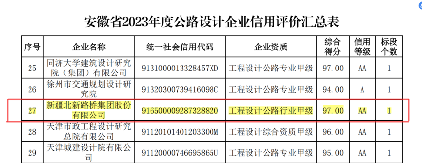 北新路桥集团再次获评安徽省公路施工和设计企业信用评价AA级时间:2024-05-06 宿州讯(孙梦凯)近日,根据安徽省交通运输厅发布《2023年度安徽省公路水运工程信用评价结果》的公告,北新路桥集团在上千家企业中脱颖而出,连续两年获评安徽省公路施工和设计企业信用评价双“AA”级,极大鼓舞了全体参建员工的士气,也为安徽宿固公司进一步开拓安徽省公路施工市场,深耕细作区域化经营打下了基础。