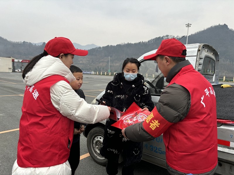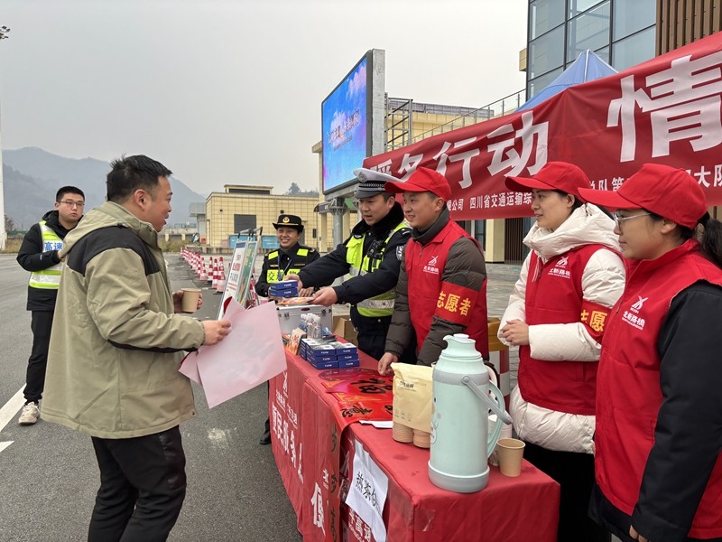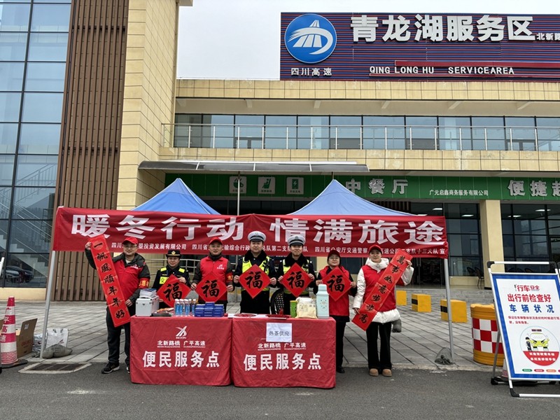 “暖冬行动、情满旅途”——广平高速志愿者在行动1月23日,广平高速“一路三方”“暖冬行动、情满旅途”志愿者服务活动在青龙湖服务区启动。重庆两江新区分公司(运营公司)广平高速运营中心、四川省公安厅交通警察总队二支队十三大队、四川省交通运输综合行政执法总队二支队四大队共计21名志愿者参加。 走进青龙湖服务区,绿植披挂彩灯、汽球,路灯悬挂“福”字、中国结,门窗张贴春联、窗花,广场LED屏和广播循环播放《好运来》歌舞、春运交通安全宣传视频,“年味”扑面而来。 来到设置在服务区楼前的便民服务点,“暖冬行动、情满旅途”横幅高高悬挂,桌上摆放热饮、小地产等和由春联、窗花、福字等组成的新年大礼包,志愿者笑脸相迎、热情服务。“天气冷,请喝杯热茶暖暖身子”,广平高速运营中心的志愿者在递上热茶的同时也在传递社会的温暖。“高速行驶要注意安全,祝您旅途顺利”,来自高速公安的志愿者发出温馨提示。“送您一份‘大礼包’,提前祝您和家人新年快乐”,高速执法志愿者诚挚的祝福让旅客消除了长途的疲惫。 站管人员贺红英介绍,青龙湖服务区除设置便民服务点外,还开通有“母婴室”“司机之家”;服务区超市除保障货源充足外,还设置“同城同价”货架——向旅客供应不少于3种方便面、不少于3种矿泉水。 坚持“党建+高速运营”,重庆两江新区分公司(运营公司)广平高速运营中心依托“党员服务队”,以服务区为中心、以收费站和停车区为延伸打造“1+7”服务阵地,将在春运期间持续开展“暖冬行动、情满旅途”活动,为广大旅客提供温馨的节日服务,在高速上彰显北新担当、展示行业风采。