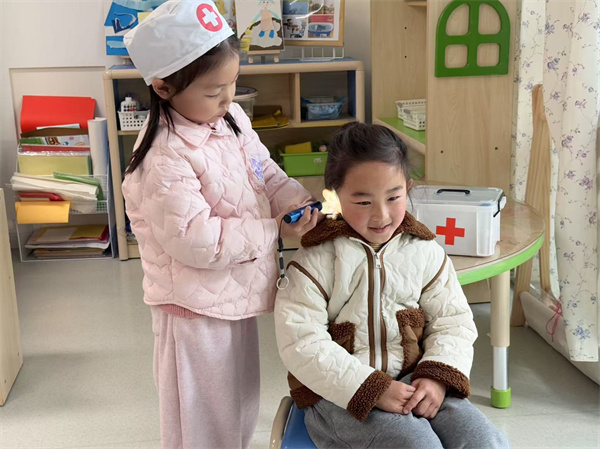 中班邀请保健老师走进活动室,开展了一场“耳朵健康小本领”。老师用生动形象的方式为孩子们讲解如何保护耳朵,避免听力受伤。随后,孩子们化身“小小医生”,拿着放大镜、手电筒,模拟为同伴检查耳朵的场景。通过角色扮演,孩子们体会到保护耳朵的责任感。