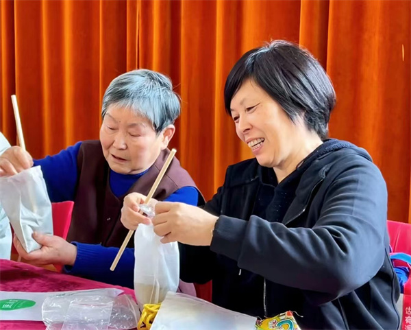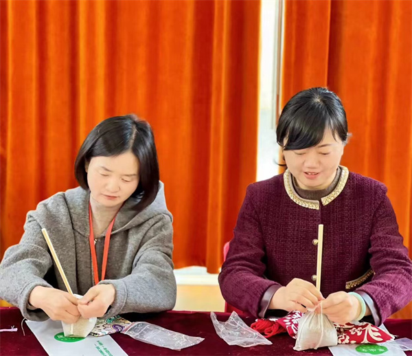 老师们拿到材料包后根据制作视频和制作图解,一个个辅材在指尖翻飞,一根根艾草棍经过巧手缠绕,很快精巧的艾草锤便制作完成。 退休老教师们回到自己曾经奋斗的校园,感到无比的亲切,和好友一起聊聊过往,叙叙今日,拿起刚刚做好的艾草锤,你帮我敲敲肩膀,我帮你拍拍肘窝,现场气氛好不热闹。
