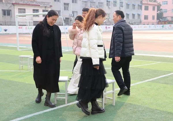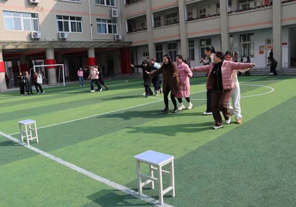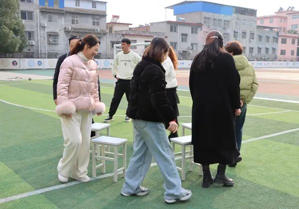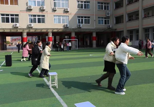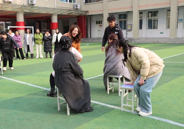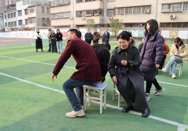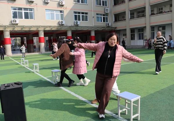 随着音乐的节奏,老师们围绕着板凳轻快地跳动,眼睛紧紧盯着目标。音乐一停,大家迅速反应,抢夺板凳。有人成功落座,欢呼雀跃;有人虽慢一步,但笑容依旧灿烂。这个游戏让大家在轻松愉快的氛围中,感受到了运动的乐趣和竞争的刺激。