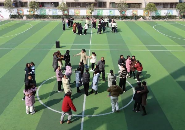 02 桃花朵朵开 “桃花桃花朵朵开,请问开几朵……”“开3朵!”老师们在主持人的指令中迅速抱团开花,在愉悦的氛围里欢呼奔跑,互相拥抱,游戏增进了彼此之间的联系和默契,在欢声笑语中教师们的身心都得到了放松。