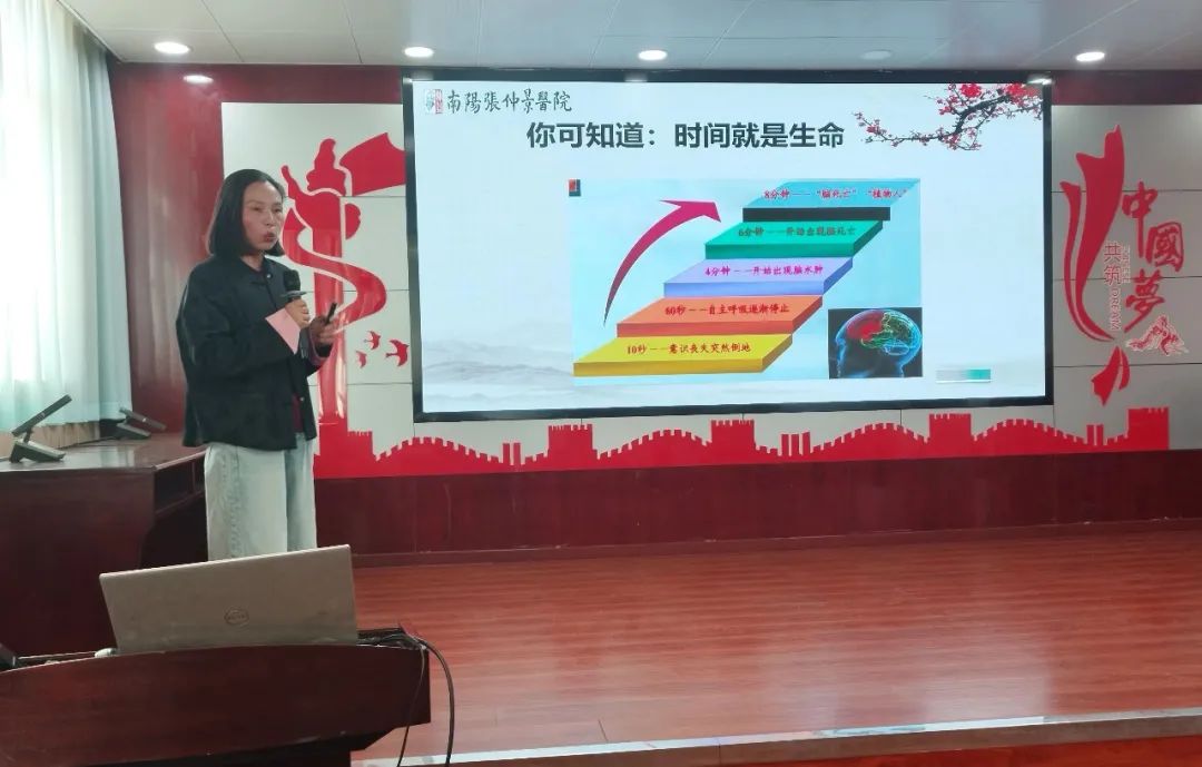 理论讲解,夯实急救知识 活动伊始,张仲景医院护理部副主任宋艳敏通过图文并茂的课件和真实案例,深入浅出地讲解了心肺复苏的重要性及黄金救援时间。从判断环境安全、确认患者意识,到胸外按压的频率与深度、人工呼吸的操作要点及流程,教师们认真记录,频频点头。随后,针对校园常见的儿童气道异物梗阻问题,专家还重点演示了海姆立克急救法的不同操作手法,并强调“成人急救与儿童急救的差异”,帮助教师们掌握科学方法。