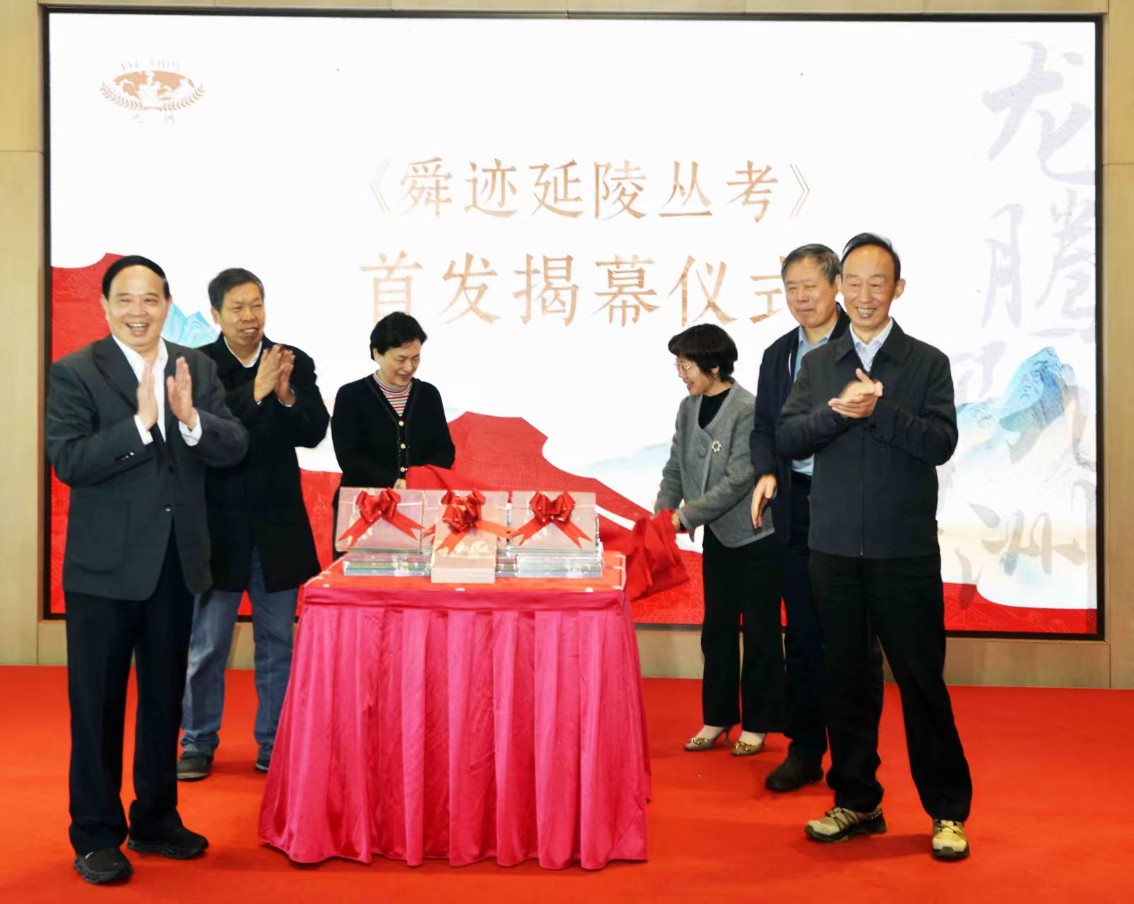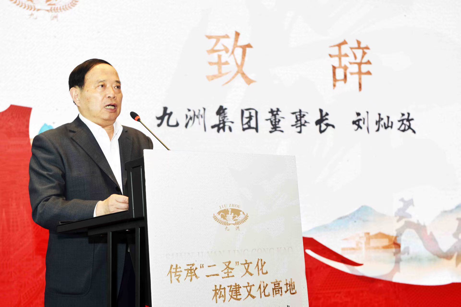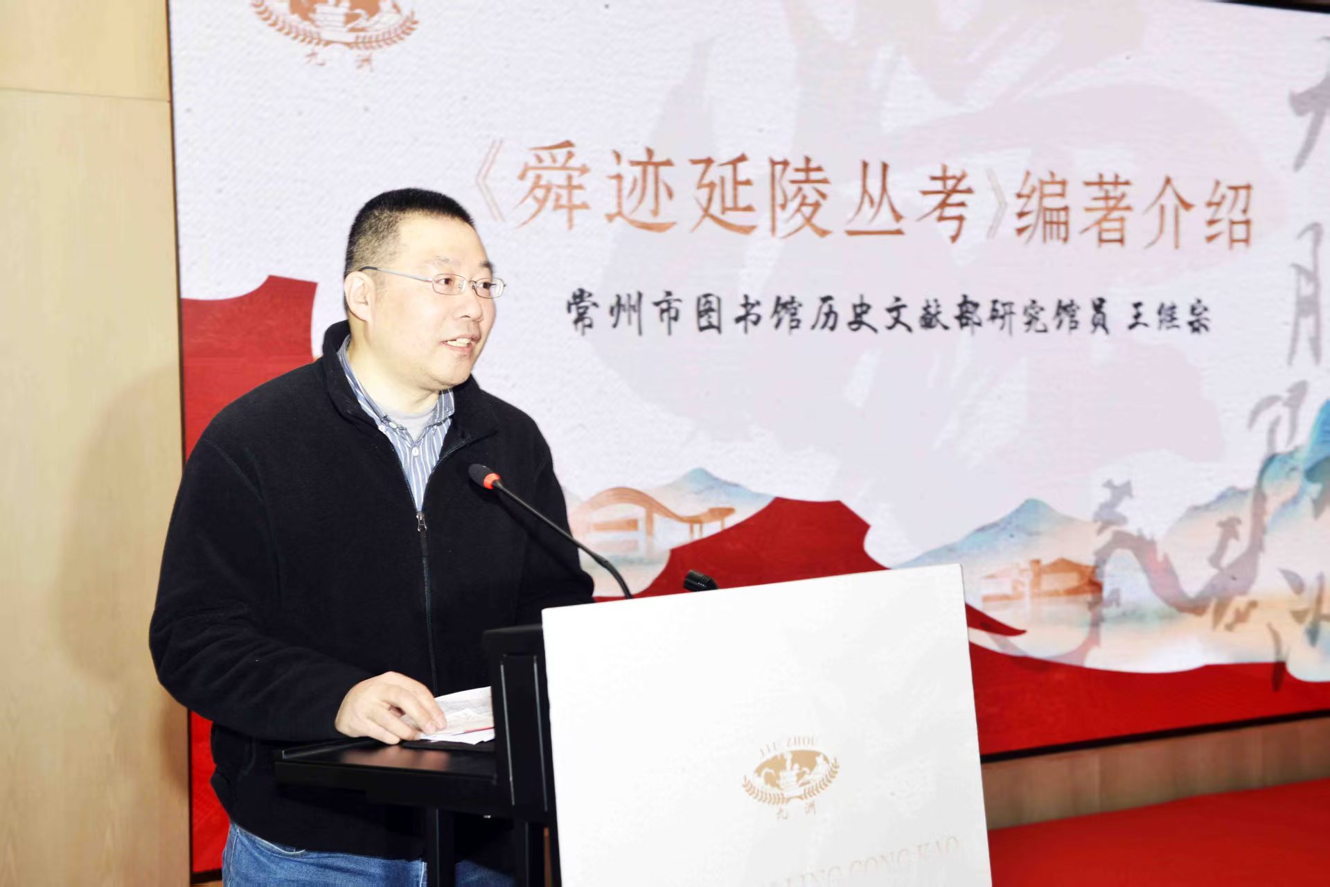 江苏九洲集团董事长刘灿放致辞。 在热烈的掌声中,江苏省政协原副主席、常州市委原书记范燕青,南京大学教授、博士生导师、南京大学季子与吴文化研究院院长、江苏省季子文化研究会会长周群,江苏九洲集团董事长刘灿放,与《舜迹延陵丛考》编著者、常州市图书馆历史文献部研究馆员王继宗,共同为新书揭幕。 九洲集团董事长刘灿放向与会嘉宾表示热烈欢迎,指出本次会议的重要意义,希望通过此次新书首发式和“二圣”文化研讨会,推动虞舜、季子文化研究的全面、系统和深入发展,构建舜山小镇的文化高地,促进“二圣”文化的传承和发扬。他说,我是郑陆本地人。从小在这片土地上长大,对这片土地有着深厚的感情。这片有着悠久历史和灿烂文化的土地,孕育了无数的英才,也承载了我们共同的回忆。我在这片土地上开发舜山小镇,今天又资助《舜迹延陵考》一书的出版和发布,要说有什么目的,那就是想让常州的历史文化能够更好地传承下去,让更多的人了解常州、爱上常州。