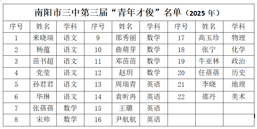 第三届“青年才俊”合影 青春因磨砺而出彩,人生因奋斗而升华。第三届“青年才俊”培养工程的启动,不仅是青年教师成长的“加油站”,更是三中教育高质量发展的“强引擎”。愿每一位青年教师以此次仪式为起点,在学校的托举与引领下,以“追光者”的姿态深耕教育沃土,以“开拓者”的勇气勇立时代潮头,用热爱与智慧书写属于三中人的青春答卷! |
