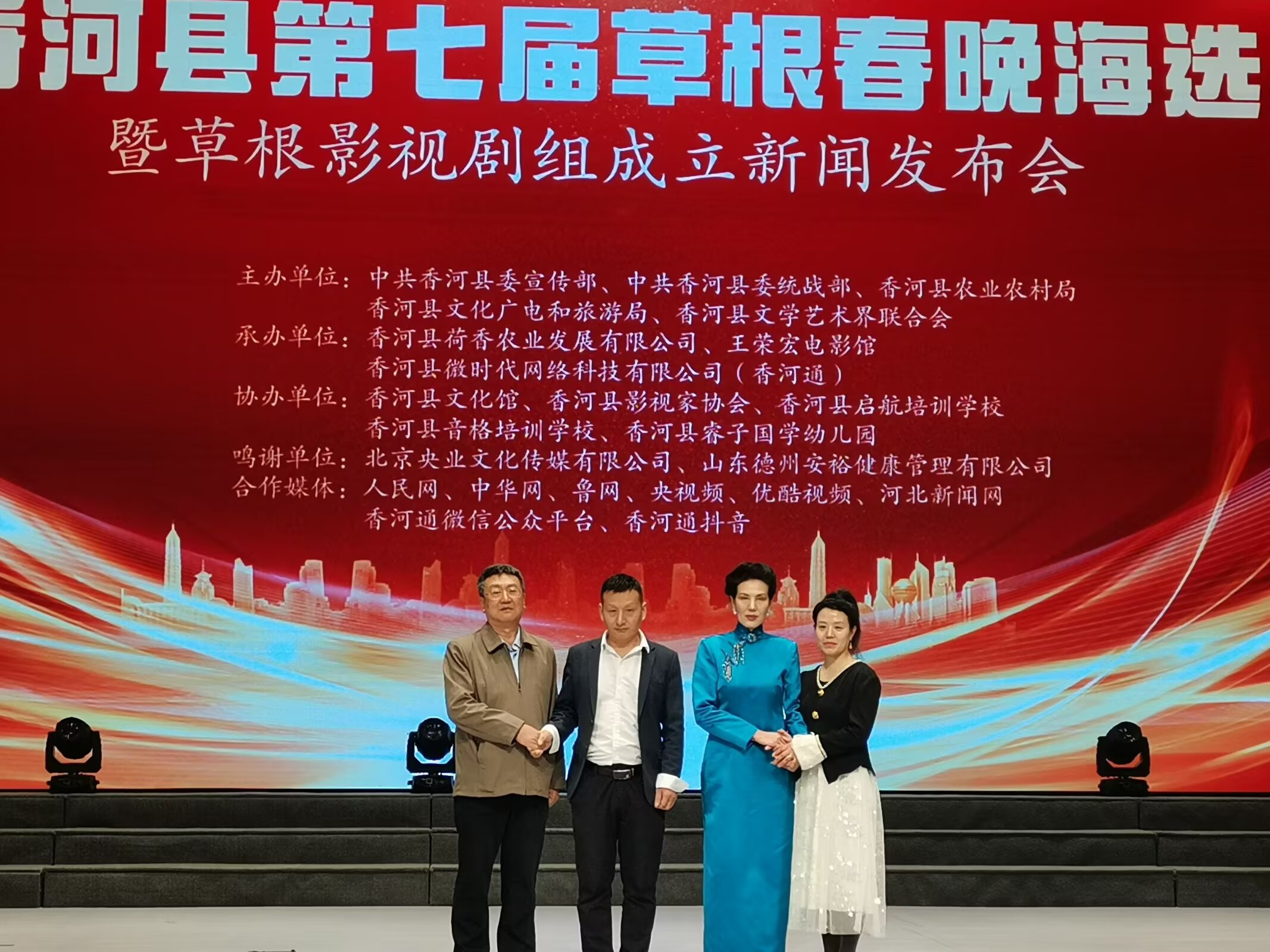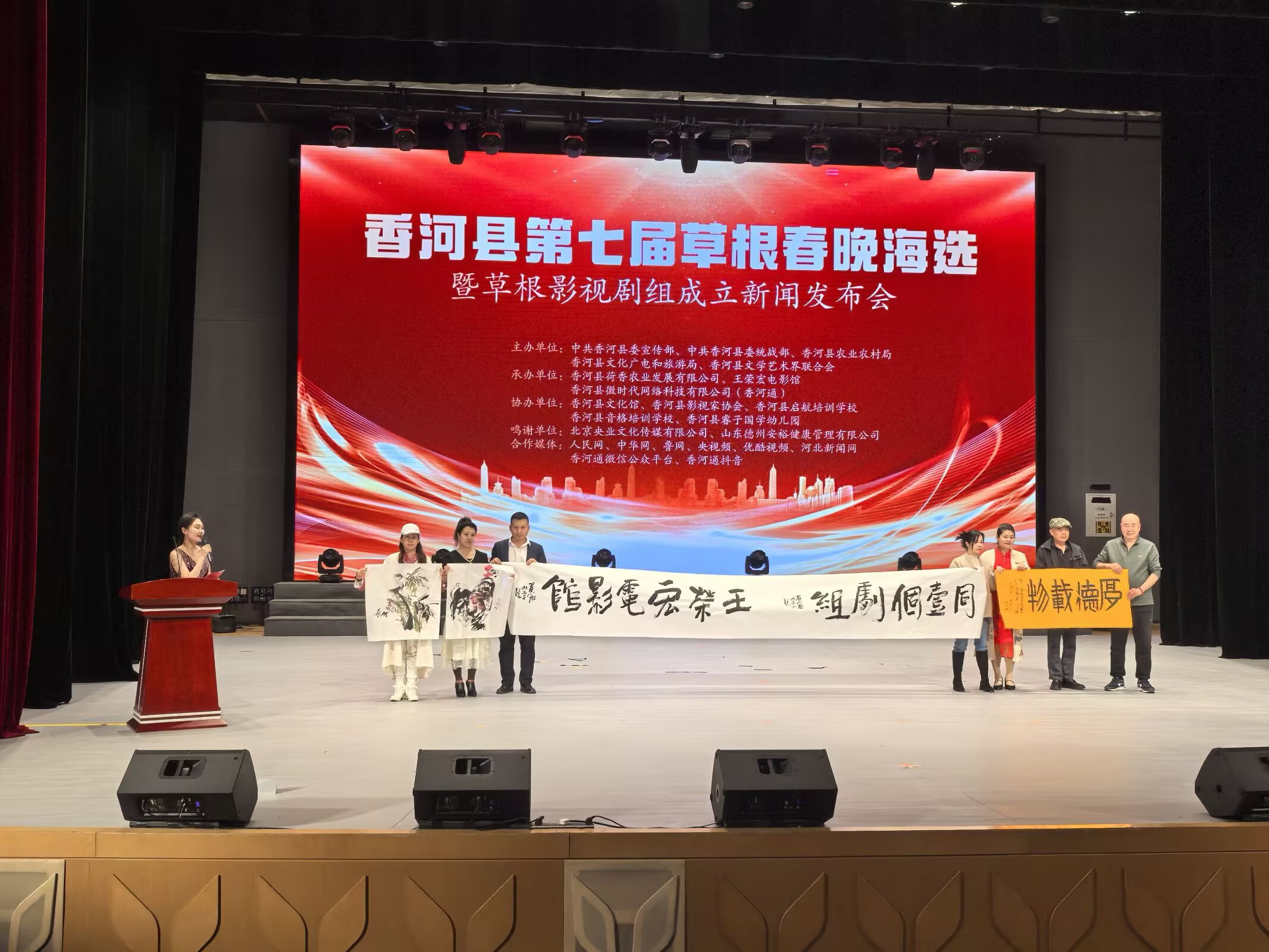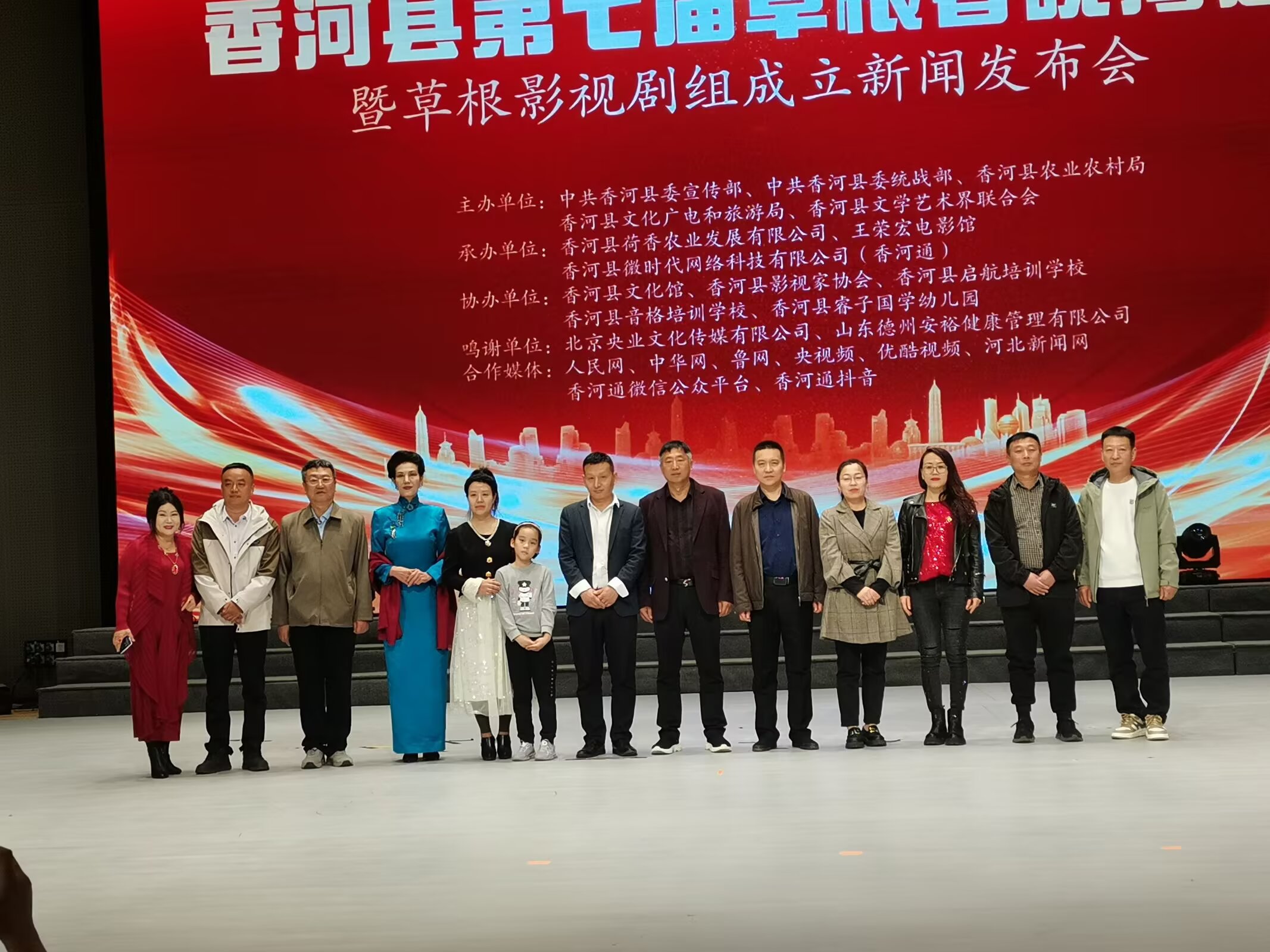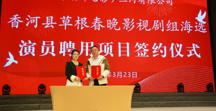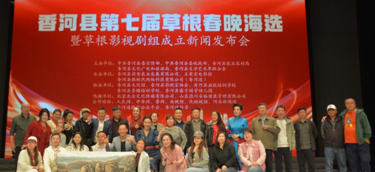 河北省香河县第七届草根春晚海选暨草根影视剧组成立新闻发布会举行时间:2025-03-28 阳春三月,草长莺飞。3月23日下午,河北省香河县第七届草根春晚海选暨草根影视剧组成立新闻发布会在香河县文化艺术中心剧场隆重举行。发布会由中共香河县委宣传部、香河县委统战部、香河县文学艺术界联合会、香河县农业农村局主办,王荣宏电影馆、香河县荷香农业发展有限公司、香河县微时代网络科技有限公司(香河通)承办, 香河县文化馆、香河县影视家协会、香河县启航艺术培训学校、香河县音格培训学校、香河县睿子国学幼儿园协办。北京央业文化传媒有限公司、国美平易唐山运营中心、山东德州安裕健康管理有限公司对本次活动予以了大力支持。