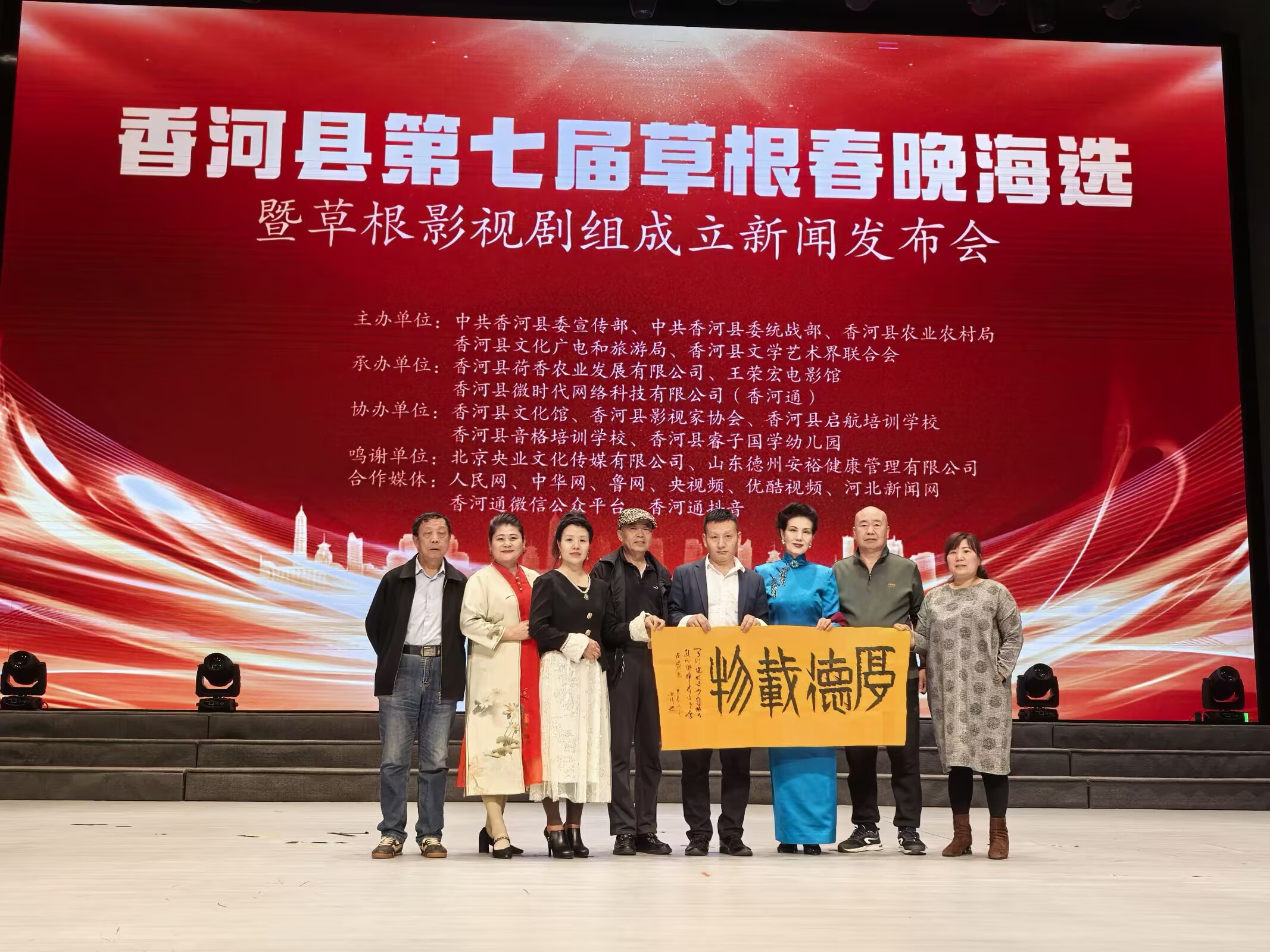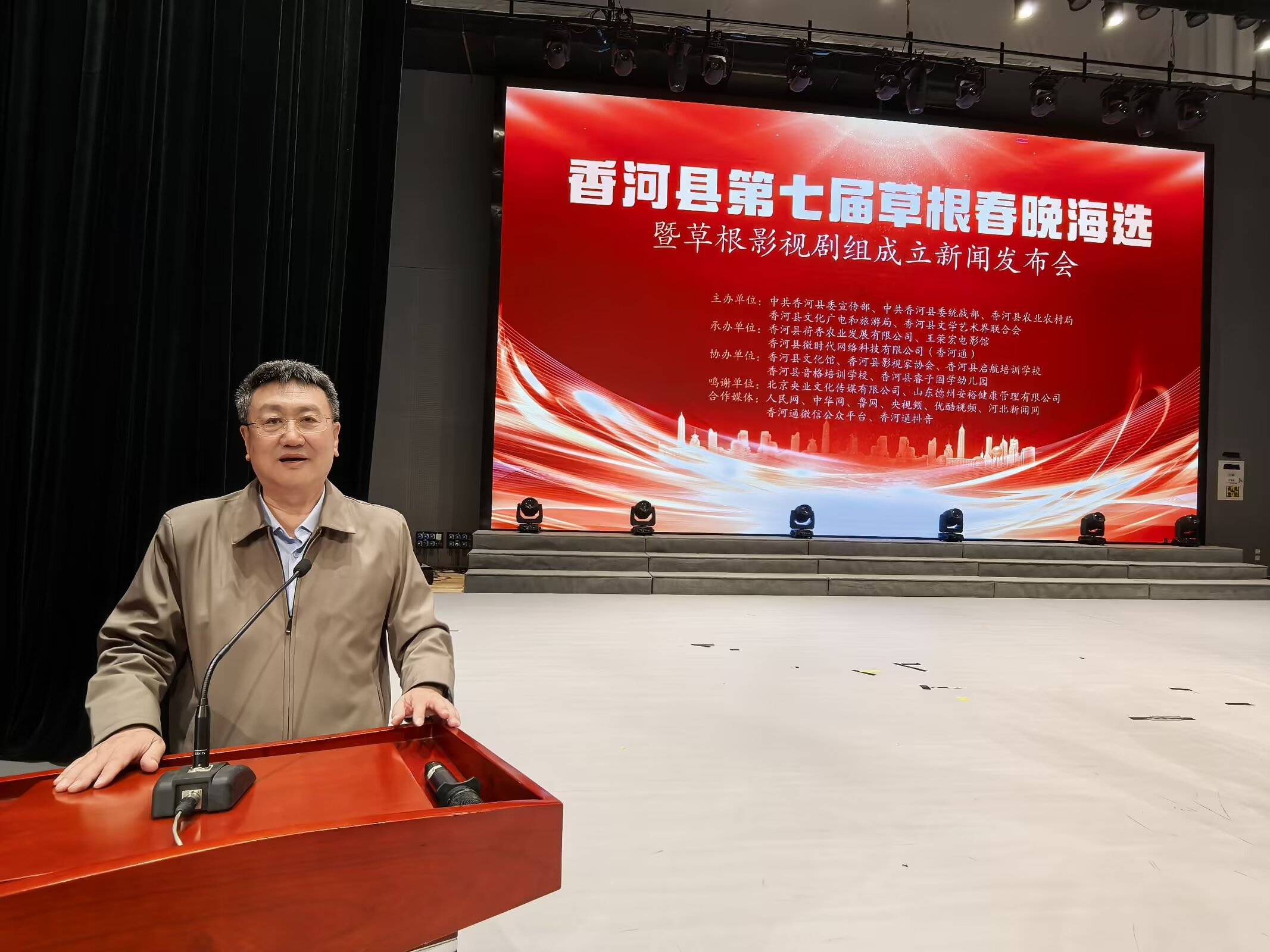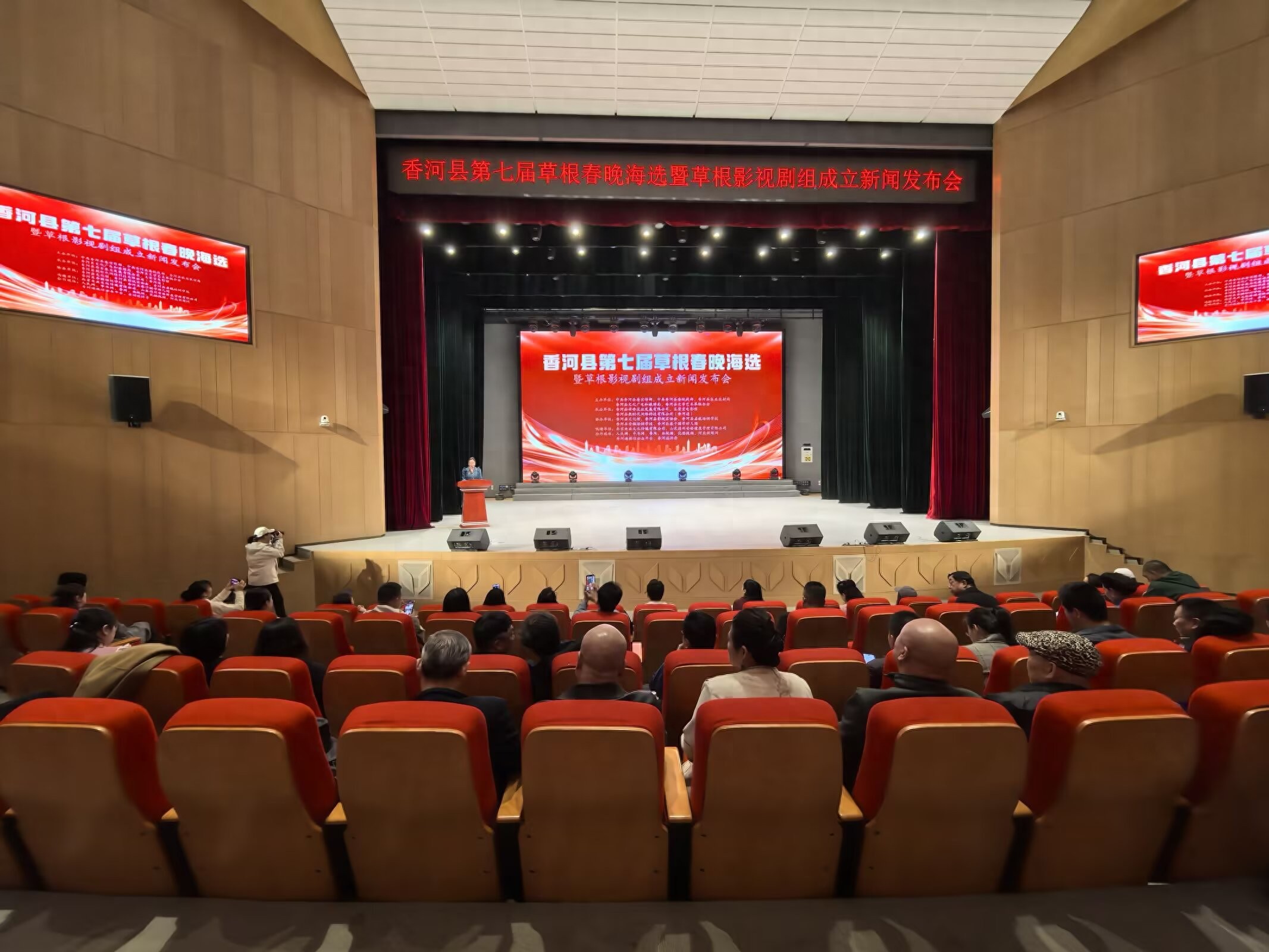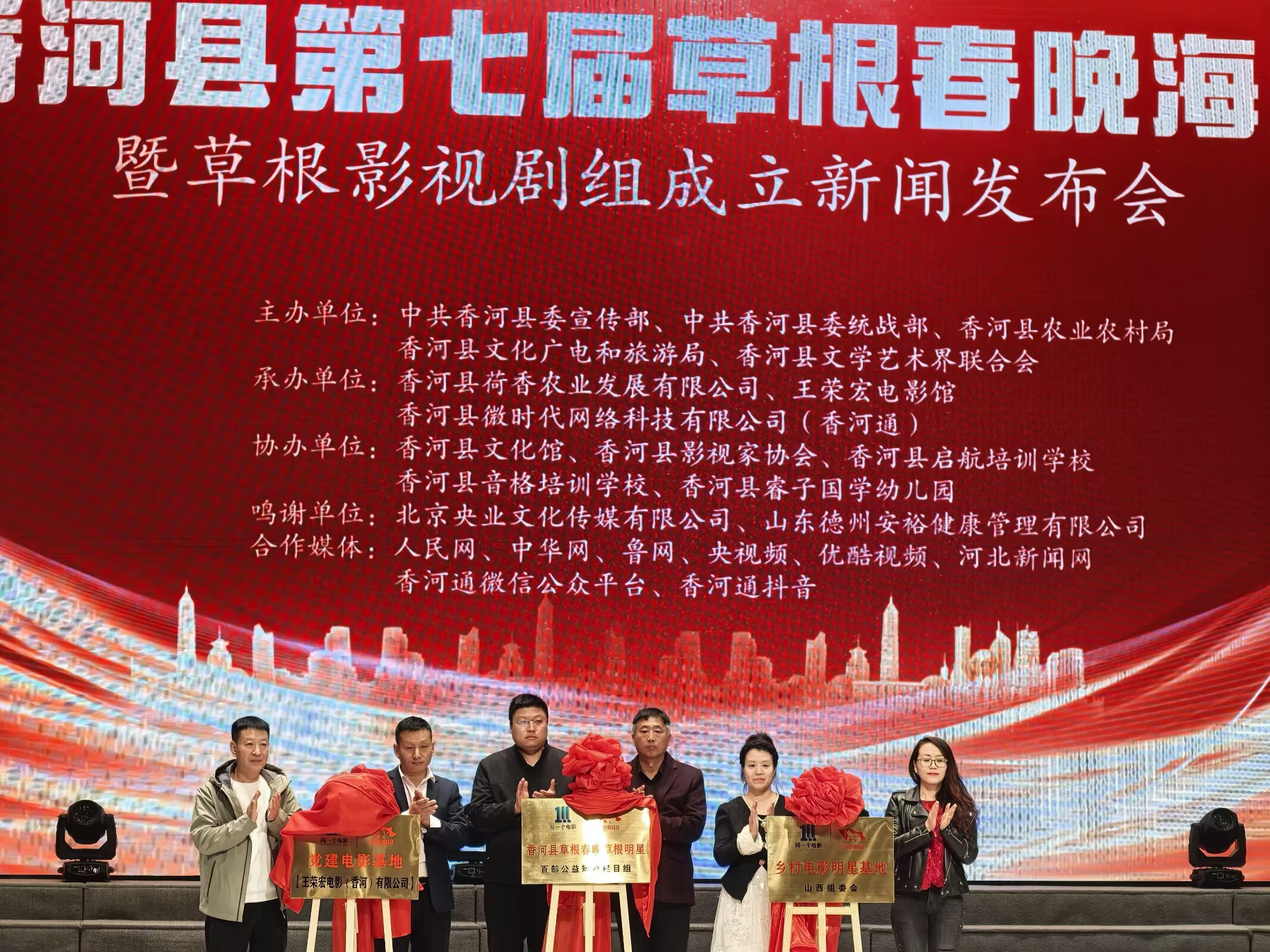 河北省香河县第七届草根春晚海选暨草根影视剧组成立新闻发布会举行时间:2025-03-28 阳春三月,草长莺飞。3月23日下午,河北省香河县第七届草根春晚海选暨草根影视剧组成立新闻发布会在香河县文化艺术中心剧场隆重举行。发布会由中共香河县委宣传部、香河县委统战部、香河县文学艺术界联合会、香河县农业农村局主办,王荣宏电影馆、香河县荷香农业发展有限公司、香河县微时代网络科技有限公司(香河通)承办, 香河县文化馆、香河县影视家协会、香河县启航艺术培训学校、香河县音格培训学校、香河县睿子国学幼儿园协办。北京央业文化传媒有限公司、国美平易唐山运营中心、山东德州安裕健康管理有限公司对本次活动予以了大力支持。