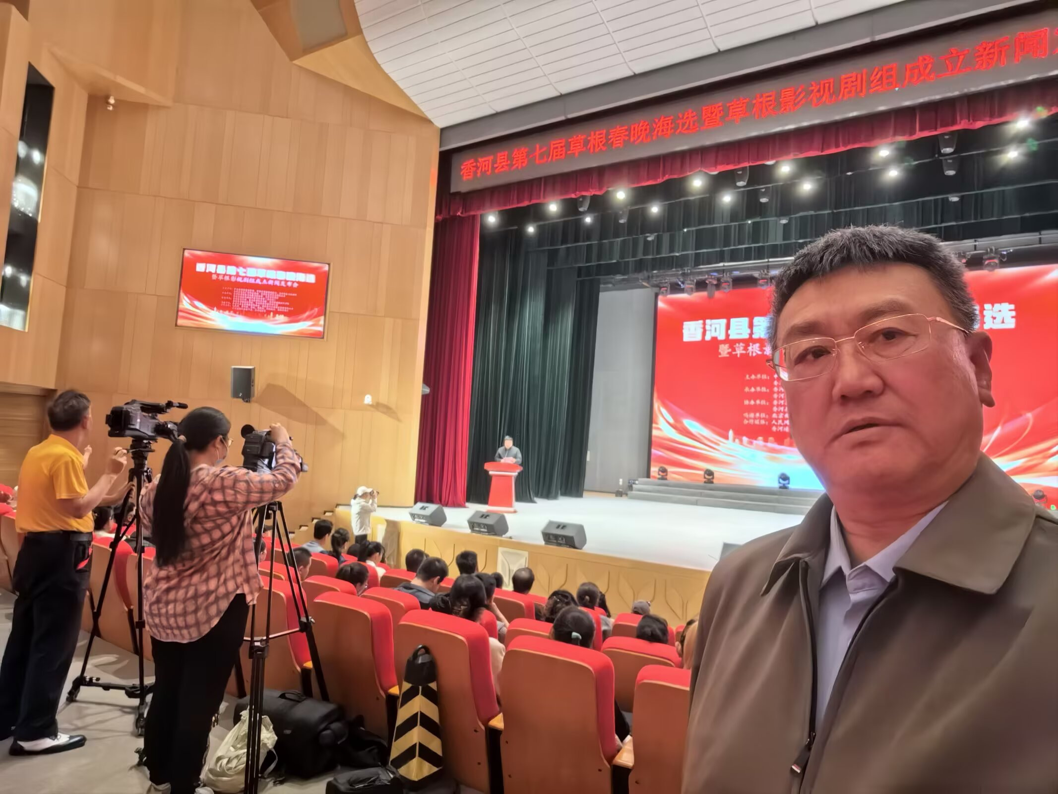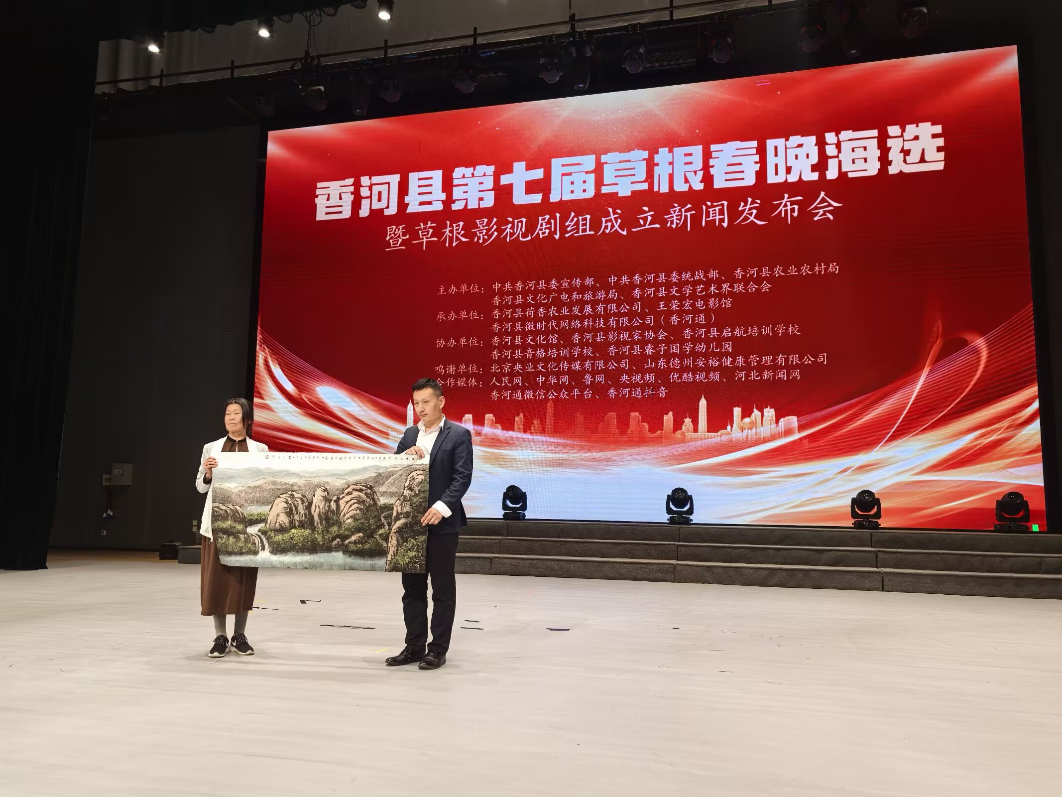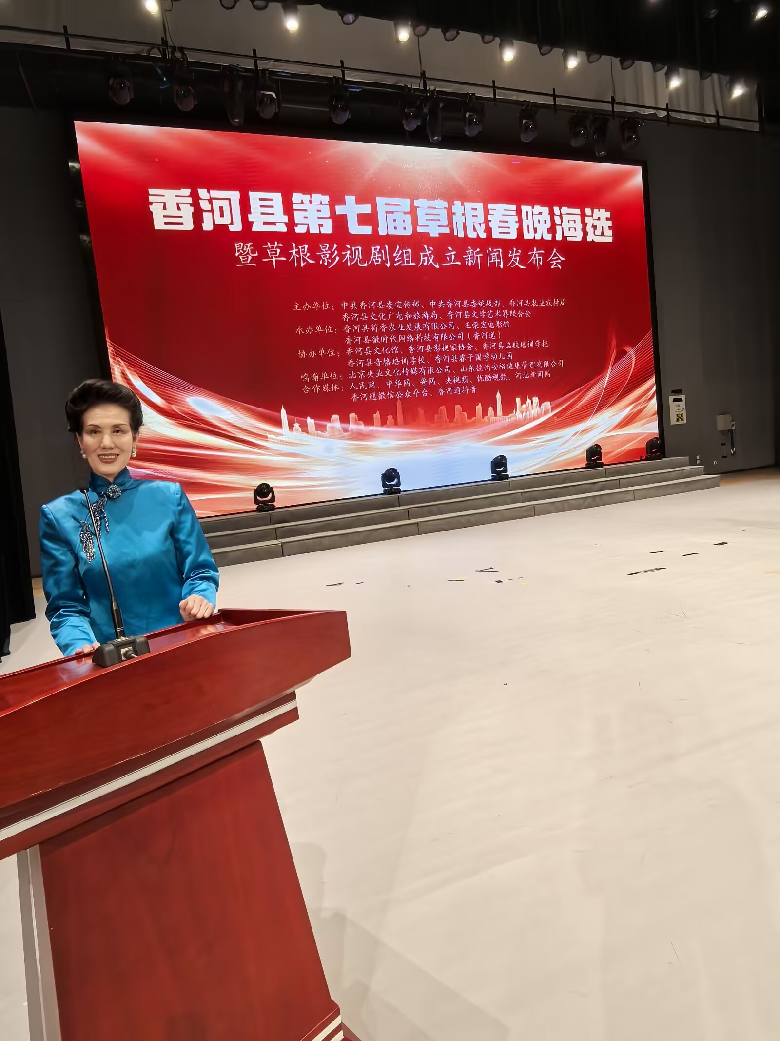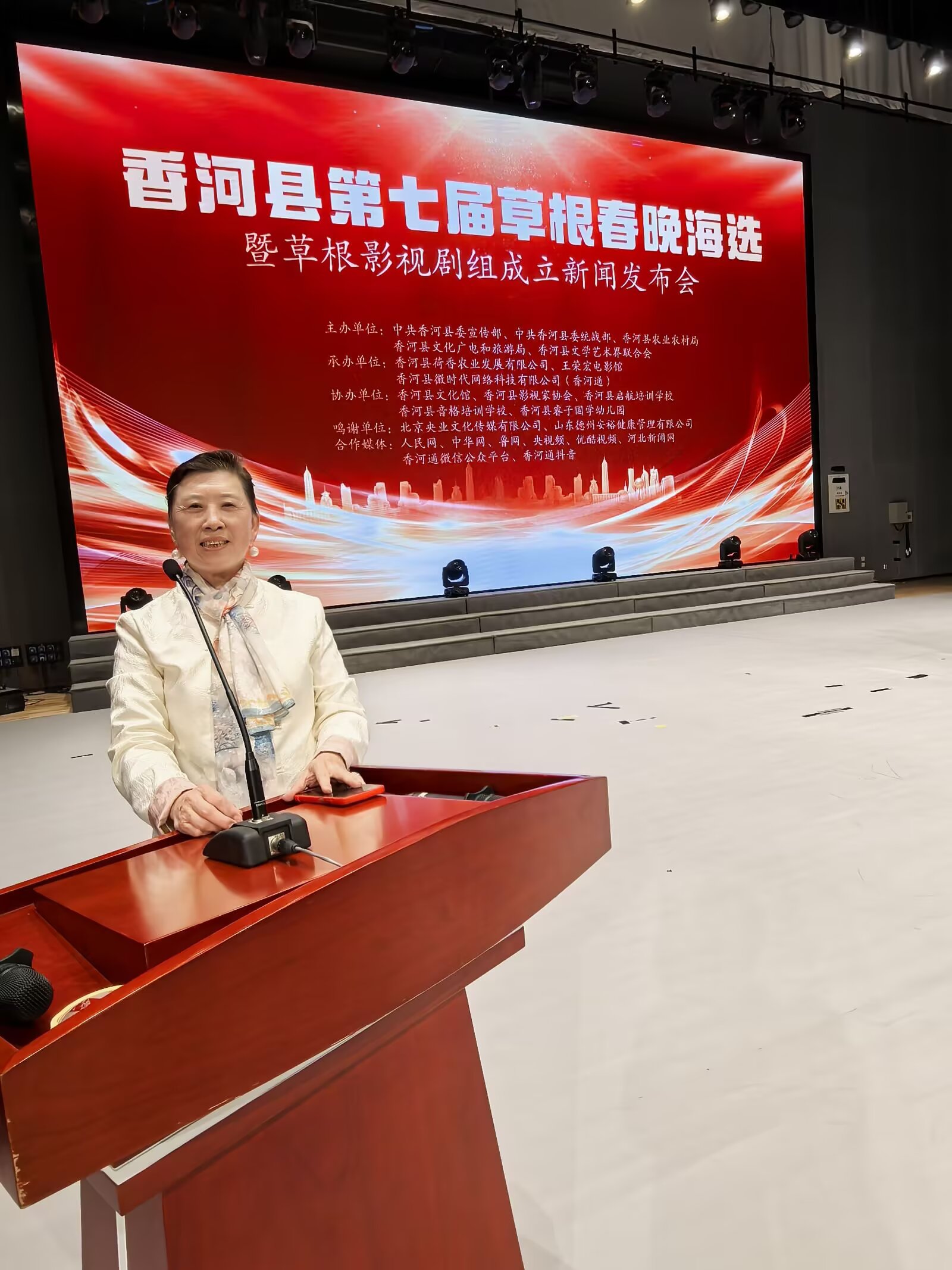 河北省香河县第七届草根春晚海选暨草根影视剧组成立新闻发布会举行时间:2025-03-28 阳春三月,草长莺飞。3月23日下午,河北省香河县第七届草根春晚海选暨草根影视剧组成立新闻发布会在香河县文化艺术中心剧场隆重举行。发布会由中共香河县委宣传部、香河县委统战部、香河县文学艺术界联合会、香河县农业农村局主办,王荣宏电影馆、香河县荷香农业发展有限公司、香河县微时代网络科技有限公司(香河通)承办, 香河县文化馆、香河县影视家协会、香河县启航艺术培训学校、香河县音格培训学校、香河县睿子国学幼儿园协办。北京央业文化传媒有限公司、国美平易唐山运营中心、山东德州安裕健康管理有限公司对本次活动予以了大力支持。