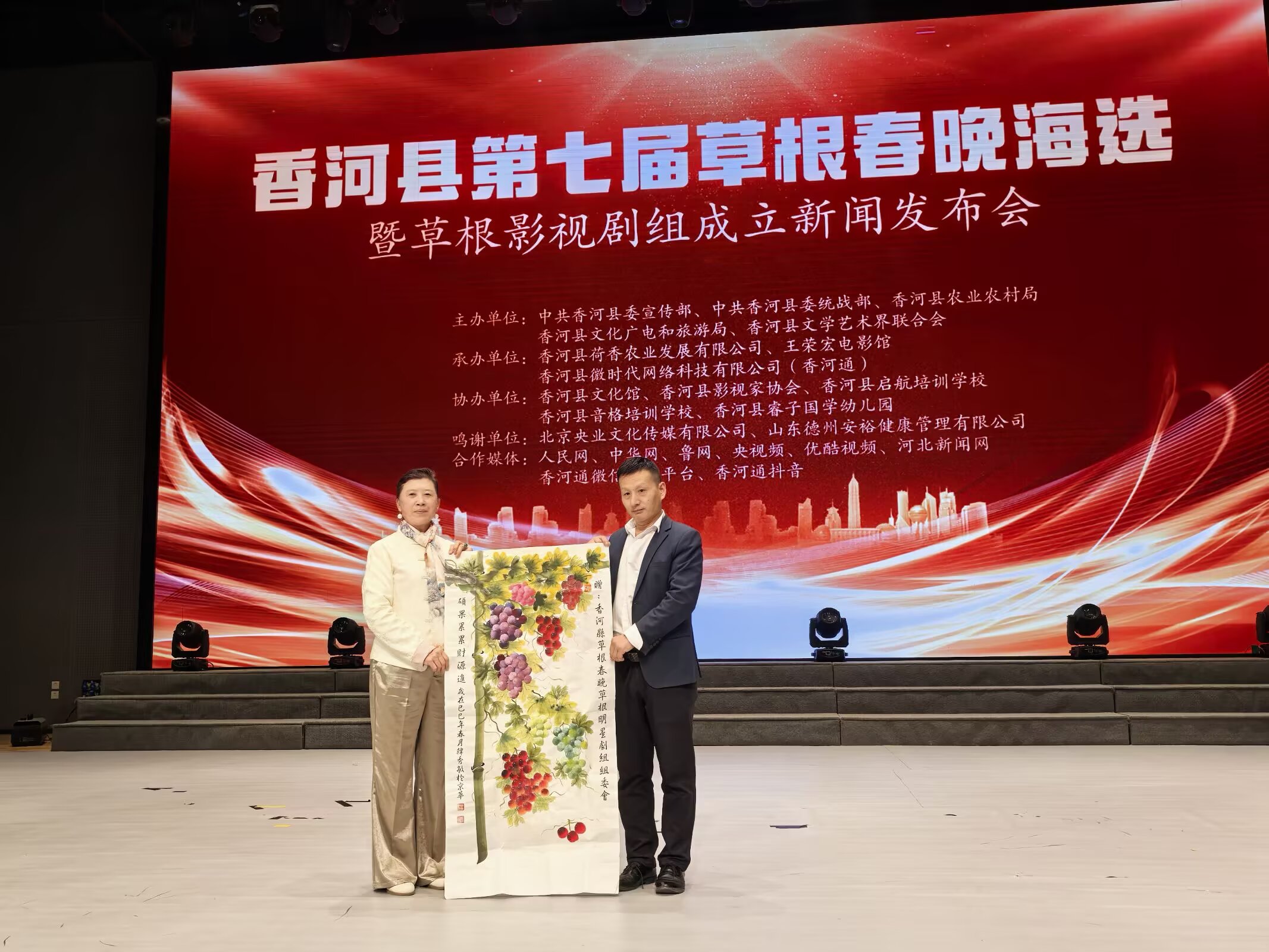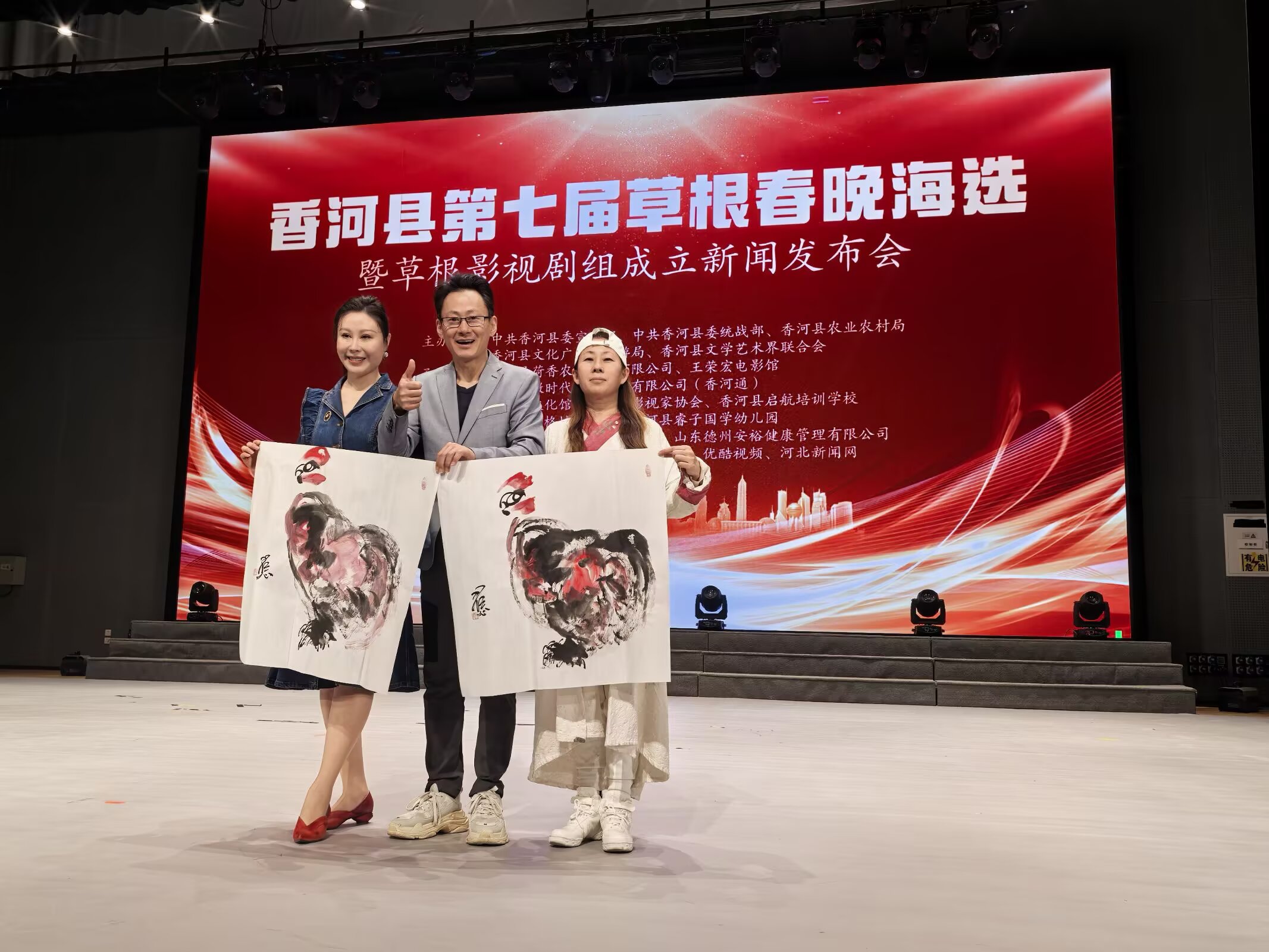 到场的草根春晚草根影视明星剧组在艺术界的名家代表纷纷登台致贺辞。名导演代表中国电影集团艺术中心签约导演涂京江表示:从事影视行业数十年,一直致力于传递积极向上的价值观。今天,能够见证草根影视明星剧组的成立,感到非常振奋和鼓舞。作为资深的从业者,愿意帮助香河的影视艺术爱好者接触电影艺术。非常期待香河能海选出好苗子,我也筹备儿童电影,有合适的演员,可以参演他导演的电影。特型演员代表、优秀党支部书记秦红霞致词道,她由衷的祝贺香河县草根春晚草根影视明星剧组的成立,愿意为香河的影视事业尽自己力所能及的微薄之力。实力派男演员代表袁宇龙致词说,向草根春晚草根影视明星剧组成立表示热烈的祝贺!期待与草根明星剧组进行更多的合作与交流,共同为观众带来更多优秀的影视作品。祝愿草根影视明星剧组在未来的发展中越来越红火,成为影视界的璀璨明珠!青年女演员代表娜娜致词,向草根春晚草根影视明星剧组成立表示热烈的祝贺!我们期待与草根影视明星剧组进行更多的合作与交流,共同为观众带来更多优秀的影视作品。祝愿草根影视明星剧组在未来的发展中越来越红火,成为影视界的璀璨明珠!著名舞蹈家、影视演员于咏圻致词,很荣幸能作为知名舞蹈家代表,见证香河县草根春晚草根影视明星剧组的诞生!草根春晚六年来的坚持,让我看到了一方水土孕育的蓬勃生命力。无论是田间地头的欢歌,还是街头巷尾的舞步,都是最真挚的生活画卷。而影视剧组的成立,更将让这些鲜活的草根故事,通过镜头走向全国、走向世界!祝愿第七届草根春晚海选圆满成功!愿草根影视剧组以艺术之光,照亮乡村振兴之路,舞出时代新风采!音乐人代表、优秀政协委员、音乐协会主席任丽致词,代表草根春晚草根影视明星剧组在音乐届的团队向草根剧组致以最诚挚的祝贺!她愿意用歌声助力草根影视明星剧组发展,祝愿香河草根影视明星剧组成就草根明星!名画家代表、中国书画艺术研究院副院长、画家韩秀敏向剧组赠送了水墨画作品并祝贺词,她代表草根春晚草根影视明星剧组在美术届的朋友向草根春晚草根影视明星剧组致以最美好的祝愿!美术与影视在视觉艺术上有着密切的联系。我们相信草根影视明星剧组一定能够在影视作品中展现出高超的美术造诣,为观众带来视觉上的盛宴。祝愿草根春晚草根明星剧组在未来的发展中不断取得新的突破!