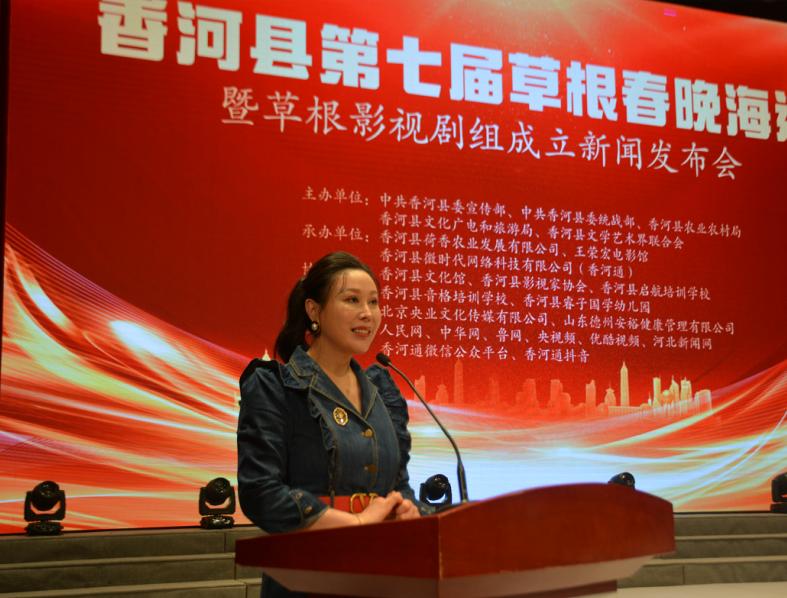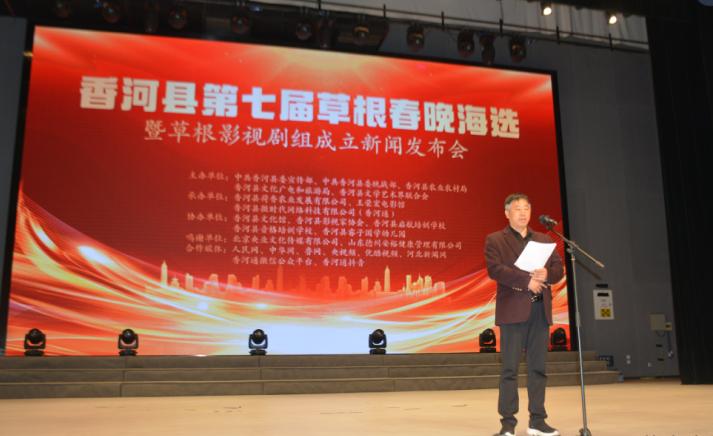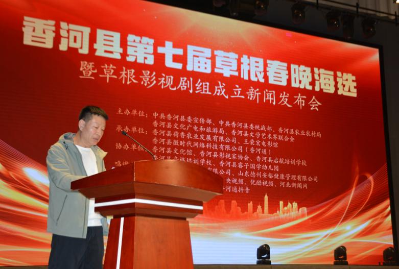 发布会上,活动承办单位“香河微时代网络科技有限公司”(香河通)的刘福营致辞。香河县草根春晚草根明星剧组总导演王荣宏宣读了影视拍摄计划,他表示:非常感谢香河县领导和企业家等社会各界的支持,感谢从全国各地赶来参加会议的艺术界朋友,特别感谢香河通公众平台刘福营先生的牵线搭桥,使同一个电影王荣宏电影馆走入香河,能参与到香河县的民间影视事业。有幸担任草根春晚影视剧组的总导演工作,对我而言是责任与奉献,我们同一个电影团队愿意做香河影视大厦的一个泥瓦工,在香河县政府的领导下,为香河的草根电影事业增砖添瓦。