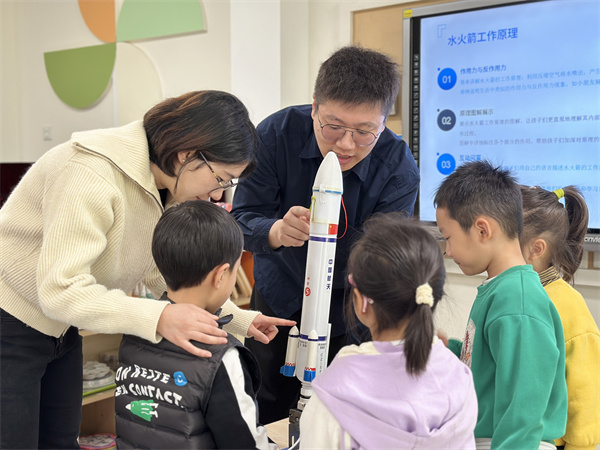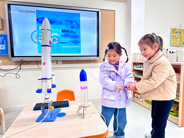 “三、二、一——发射!”中二班袁锦宸、柏慕辰家长化身科学达人带领小朋友们制作火箭。两位家长先向孩子们介绍了空气推动火箭升空的基本原理,接着小朋友们自己动手合作制作火箭。看,他们有的给塑料瓶安装尾翼,有的小心翼翼地连接打气装置。当火箭发射成功的那一刻,小朋友们兴奋地欢呼起来。