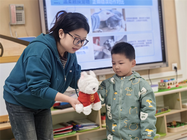 庐阳实验幼儿园教育集团红玺台总园:家园同筑梦 成长零距离为让幼儿感受不同的教育方式和知识领域,丰富幼儿在园生活,合肥市庐阳实验幼儿园教育集团红玺台总园中班组于2025年3月28日邀请家长走进幼儿园,给孩子们带来不一样的活动体验。 “猜猜猫咪喜欢被摸哪里?”中一班金承皓妈妈带来宠物安全教育活动。皓皓妈妈首先示范如何正确抚摸小动物,比如顺着小动物的毛发轻轻抚摸,动作要轻柔,避免吓到它们。结合身边具体案例,皓皓妈妈深入浅出地引导孩子们学会正确与宠物相处的方式,提高自我保护意识,避免受到不必要的伤害。