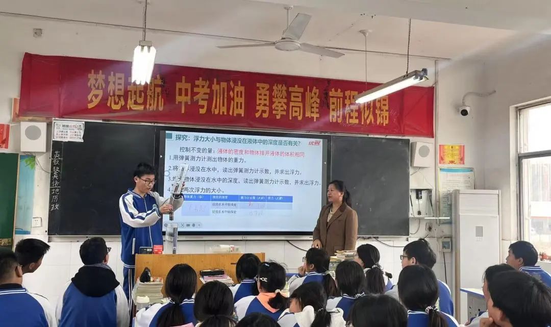 校本部八年级教师冯建臣、焦长辉、曲良科、高玉珍送教到王堂校区。 语文冯建臣老师围绕《经典常谈》的导读目标,以问题驱动和情境创设为抓手,课堂氛围轻松而富有深度。数学焦长辉老师的《反比例函数图像与性质》,不仅巧妙引导,并采用分层教学策略,对学困生给予鼓励和指导,对学有余力的学生提供拓展,实现因材施教。英语曲良科老师的设计层层递进,步步精心,将语言要素与核心素养培育深度融合,展现英语课堂的进阶之美。物理高玉珍老师的《探究浮力大小与哪些因素有关》,以科学实验为纽带,通过严谨的论证推演和批判性思维训练,架设生活现象与科学原理的认知桥梁。