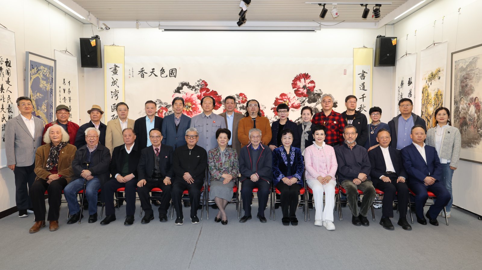 第十一届全国人大常委会副委员长、国务院原国务委员陈至立,中共中央宣传部原副部长、中国文联党组原书记、副主席胡振民,原国家物资部副部长、全国工商联党组原副书记、副主席桓玉珊,最高人民法院原副院长、第十三届全国人大宪法和法律委员会副主任江必新,第十二届全国人大常委会委员、原文化部党组副书记、副部长赵少华,国务院政策研究室原副主任、华夏文化促进会书画分会名誉顾问于赋,中共甘肃省委原常委、宣传部部长、中国艺术研究院原院长连辑,中国美协中国画艺委会秘书长、中国画学会创会副会长兼秘书长孙克,中国美协理论委员会副主任、《美术》杂志原主编王仲,中国美术家协会理事、中国女画家协会名誉主席孔紫,中国书画家联谊会主席、北京书法家协会理事舒乃仁,人民教育出版社原副社长、华夏文化促进会书画分会顾问尹鸿祝,中国书法家协会理事、北京文联原副主席彭利铭,中国文化遗产研究院副研究员、中国书画收藏家协会副会长陈秀,中国收藏家协会副秘书长、印章收藏与研究委员会副会长樊振寅,港澳台美协主席、中国画学会顾问蔡豪杰,华夏文化促进会书画分会顾问李伟成,华夏文化促进会书画分会顾问李正钢,故宫博物院办公室原主任、中国书法家协会会员魏殿松,北京政协第十一、十二届委员、北京西城文联副主席程茂全,中国女画家协会志愿团团长刘凌云,中国中文卫视台台长袁勇,中国诗书画研究会副秘书长、三才书画院院长崔巍,国家民族画院副院长刘存惠,北京正东书画院执行院长郑彩良,中国当代新水墨画研究院执行总裁张良,第十一届全国人大常委会副委员长、国务院原国务委员陈至立秘书甜红,中国文联原党组书记胡振民助理韩智慧,江苏宜兴画院秘书长蒋春荣,篆刻家刘永军;粤港澳大湾区书画艺术交流团书画家:中国书法家协会会员、中国(香港)楚简书法研究院院长李金泰,中国美术家协会会员、中国扇子艺术学会常务理事张坤,中国美术家协会会员、中国书法家协会会员田万荣,北京朝阳美协会员张宝华,美国普林顿大学艺术学荣誉博士、山东开明书画院副秘书长马金虎,中国书法家协会会员、中国书画艺术促进会副主席王占寅,河北省吉龙集团驻京企业党支部书记、北京前门商会联合党委书记张世宝,国家一级美术师、北京艺苑书画院院长朱俊国,北京大本宗书画院副院长、中央国家机关书法家协会会员战国权,国家一级书法师、中国扇子艺术学会毛体书法专委会主任萧耀明,策展人、收藏家,北京国越书画院院长吴国英,画家时凤雪,河北保定市美术家协会副主席马振国,北京画院画家张树香,翰海书画院院长、北京画派创始人李笑天,中国书画家协会会员、西安于右任书法学会会员韩民霞,红山画院院长、山东大学华夏文化研究所理事张景峰,中国艺术研究院访问学者、中国美协中国重彩画研究会会员刘冬花;来自澳门特区的嘉宾:澳门中华书画艺术协会会长张国洪,澳门中华书画艺术协会会员黎真珍,廖俏芳女士,龙耀文先生;企业界嘉宾:贵州安神酒业CEO、京京贵茅商贸有限公司董事长付运铎,贵州仁怀安神酒业总经理吴漠,北京京贵茅商贸公司总经理、贵州安神酒业销售有限公司董事长梁开勇,北京京豫公益红娘服务中心理事长闫振举;新闻媒体:华夏融媒体联席会主席团副主席常魁星,央视书画频道主任记者盛荣,《中国美术市场报》副社长杜鹃,5A画廊创始人白心,中央电视台摄影记者臧志强,北京木易鼎尚文化传媒发展有限公司负责人杨文国,腾讯记者张宇,媒体人常和书;支持单位领导:华夏文化促进会主席李小琳,华夏文化促进会副会长兼秘书长周鹏;主办单位领导:华夏文化促进会书画分会常务会长郭正英,燕京书画社社长、华夏文化促进会书画分会石占成,华夏文化促进会书画分会常务副会长兼秘书长宋伯军,燕京书画社副总经理赵青仲,华夏文化促进会书画分会副会长陶古,华夏文化促进会书画分会副秘书长刘泓,华夏文化促进会书画分会副秘书长任咏斌,华夏文化促进会书画分会副秘书长李学,华夏文化促进会书画分院办公室主任马杰,华夏文化促进会书画分会办公室副主任张宗良,华夏文化促进会书画分会外联部副主任袁源,华夏文化促进会书画分会展览部副主任白京凯等一百余人出席活动。