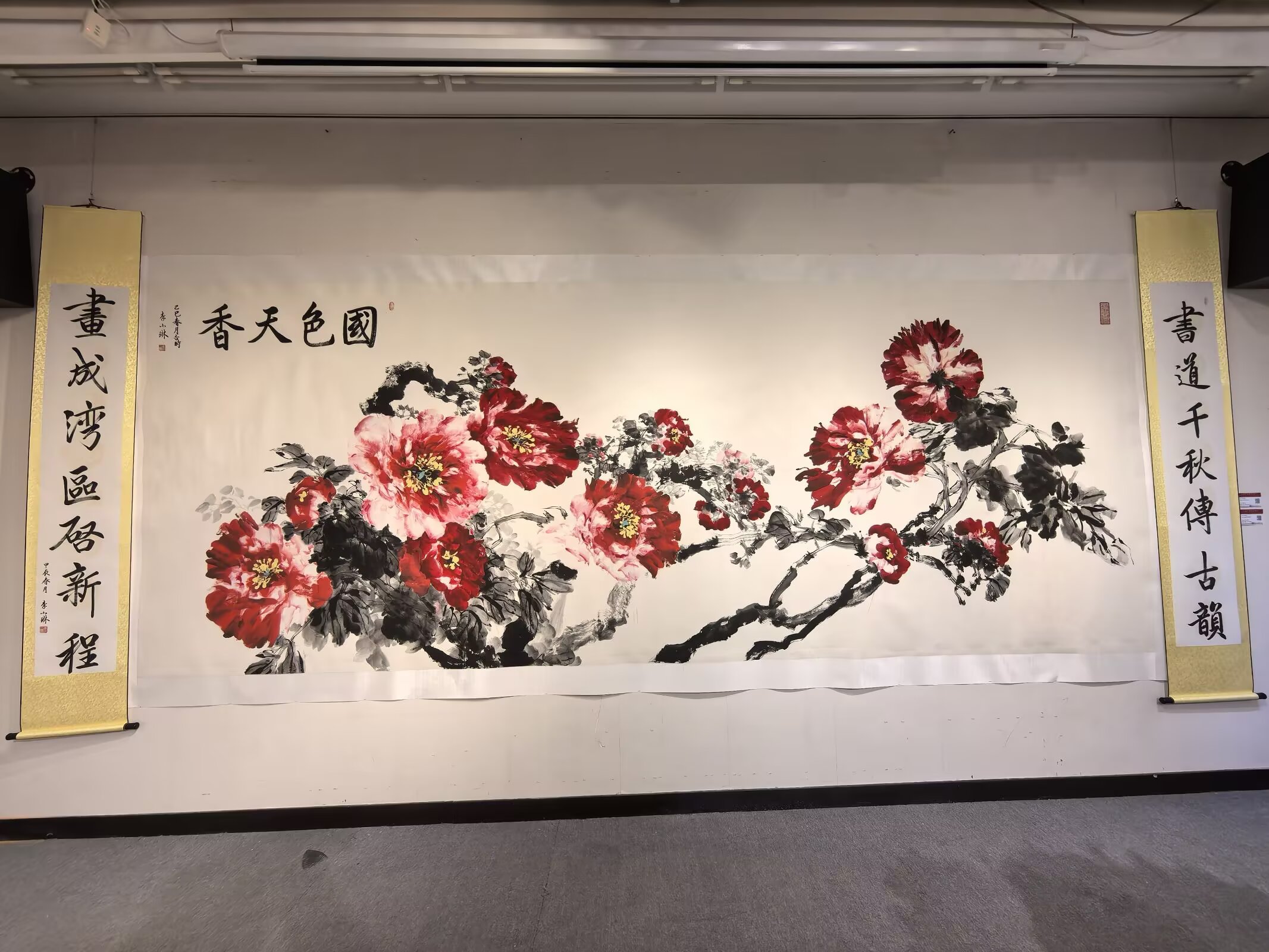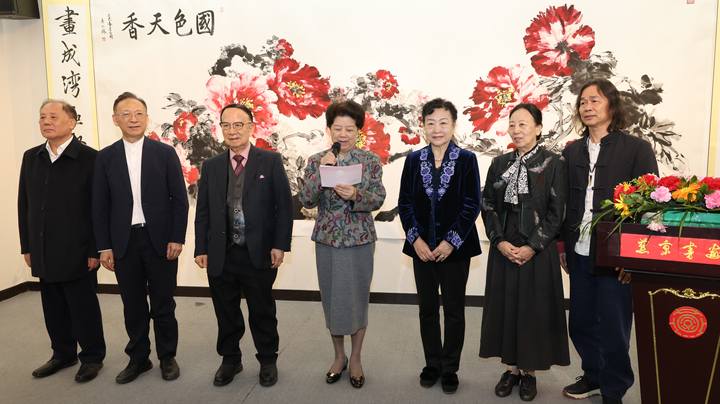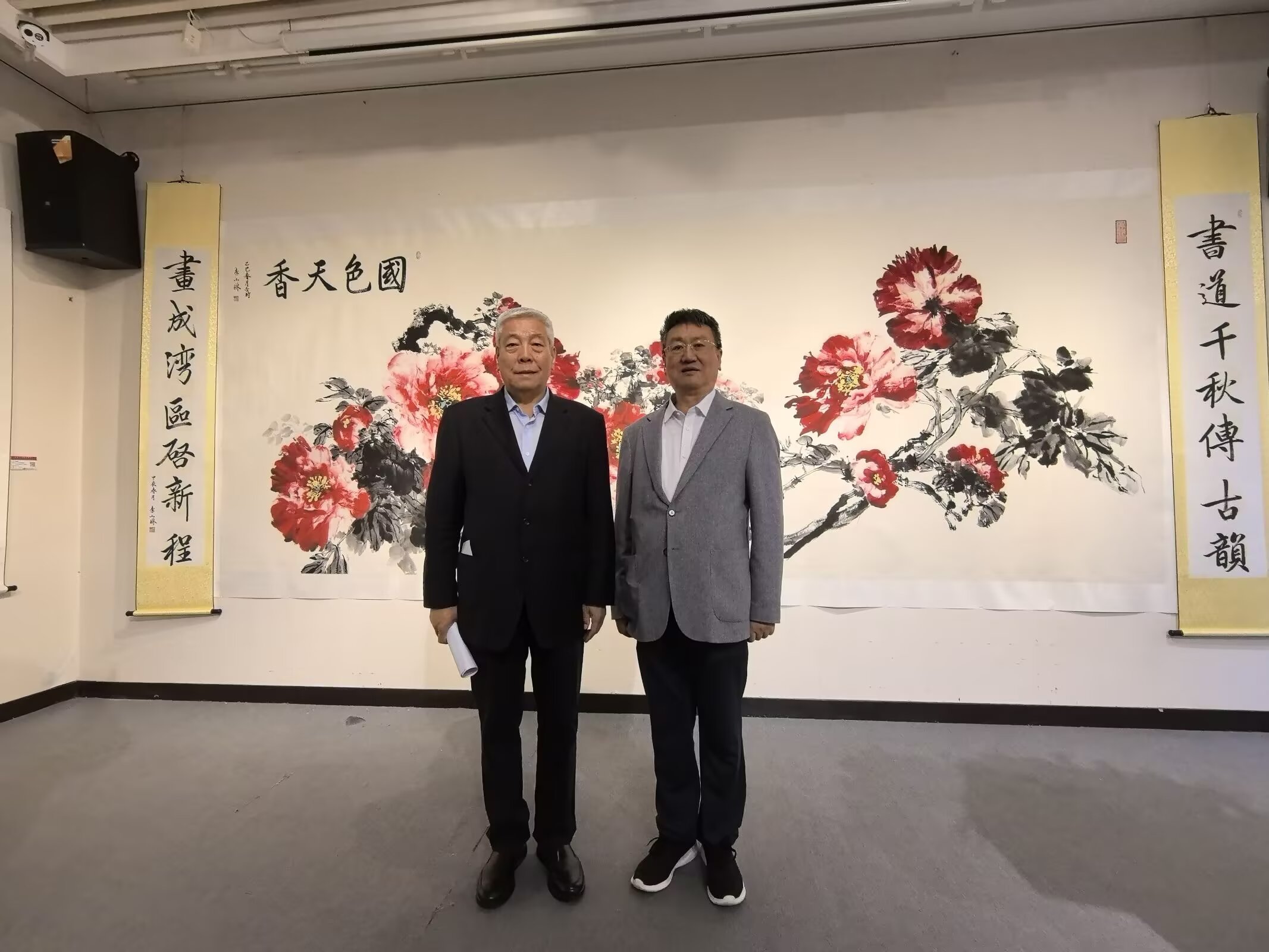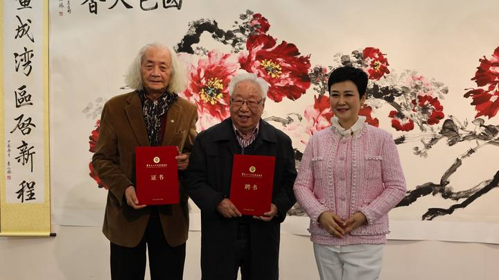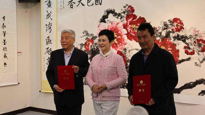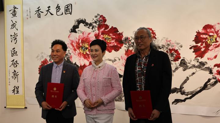 李小琳主席代表华夏文化促进会分别向出席开幕仪式的我国文化艺术界领导、专家学者、著名书画家颁发了聘书。向连辑颁发了华夏文化促进会书画分会名誉会长聘书,向著名美术评论家孙克、王仲等颁发了华夏文化促进会书画分会名誉顾问聘书,向孔紫、舒乃仁、尹鸿祝、彭利铭、石占成等颁发了华夏文化促进会书画分会顾问聘书,向程茂全、刘存惠、赵青仲、李金泰、李笑天颁发了华夏文化促进会书画分会理事聘书。向华夏文化促进会书画分会领导郭正英、张金卫、宋伯军、陶古颁发了常务会长、执行会长、常务副会长兼秘书长,副会长的聘书。这一系列聘任彰显了华夏文化促进会在推动书画艺术发展方面的专业性和权威性。 在江必新院长、于赋主任、赵少华部长、孔紫会长、蔡豪杰主席、张国鸿会长的见证下,第十一届全国人大常委会副委员长、国务院原国务委员陈至立宣布“首届粤港澳大湾区书画艺术交流汇报展”开幕。 本次展览展出胡振民、李乾元、范印华、厉有为、桓玉珊、江必新、赵少华、樊振寅、陈广文、王文章、覃志刚、于赋、连辑、张旭、冯远、夏潮、官景辉、苏士澍、李小琳、苏树辉、郜宗远、尼玛泽仁、林阳、张飙、徐里、罗杨、郭怡孮、孙克、王仲、李庚、李培隽、舒乃仁、许钦松、张德俊、叶培贵、张 继、彭利铭、田伯平、刘俊京、王云武、肖良平、陈秀、魏殿松、程茂全、宋伯军、陶古、赵青仲等老部长、老将军、文化艺术界领导、专家学者、著名书画家题写贺词、墨宝,还展出了粤港澳大湾区书画艺术交流团书画家郭正英、李秀峰、李金泰、张坤、赵玉杰、田万荣、张宝华、马金虎、王占寅、张世宝、朱俊国、战国权、萧耀明、吴国英、李勇逸、时凤雪、马振国、陈若文、张树香、李笑天、韩民霞、王振渊、张景峰、刘冬花的作品,以及来自香港特区书画家陈志恒、李可玉、梁暖、黎富強、麦锦超、郭洪球、廖汉和、伍槐枝、蔡传达、梁志光、陈月琼、冯美芳;来自澳门特区书画家张国洪、陈国森、陈忠华、卢振雄、岑建平、左伟鸿、刘丽珍、黎真珍、杜国安、江佩仪作品近百幅。作品题材丰富、形式多样,涵盖了山水、花鸟、人物及书法等多个领域,充分展现了中华书画艺术的独特魅力。本次活动展览现场还特别展出了李小琳主席的丈六巨幅国画《国色天香》及题词墨宝,其作品笔力雄健、气韵生动,展现了深厚的文化底蕴,成为展览的一大亮点,为活动注入了强大文化引领力。中国当代书法家、著名美术评论家、九十高龄的孙克老先生有感而发道:“李小琳主席画的巨幅牡丹,让人深感振奋,她作为一个成功的企业界人士,还有这么强大的精力来画这么大的巨幅作品,很是难得。自古以来大家都在画牡丹,但是能画的很高雅,充满力度、精气神,是很不容易的。李小琳主席的牡丹气质很厚重,用笔非常的强劲,可见李小琳主席人格修养很有底气。她的画很有灵气,这不是一般人能达到的。这点我很欣赏。纵观整个作品艳而不俗,作为非专业画家,她的画绝不亚于一个专业的画家,这是很难得的。”多位参观者在李小琳主席作品前驻足欣赏,对其艺术造诣给予高度评价。