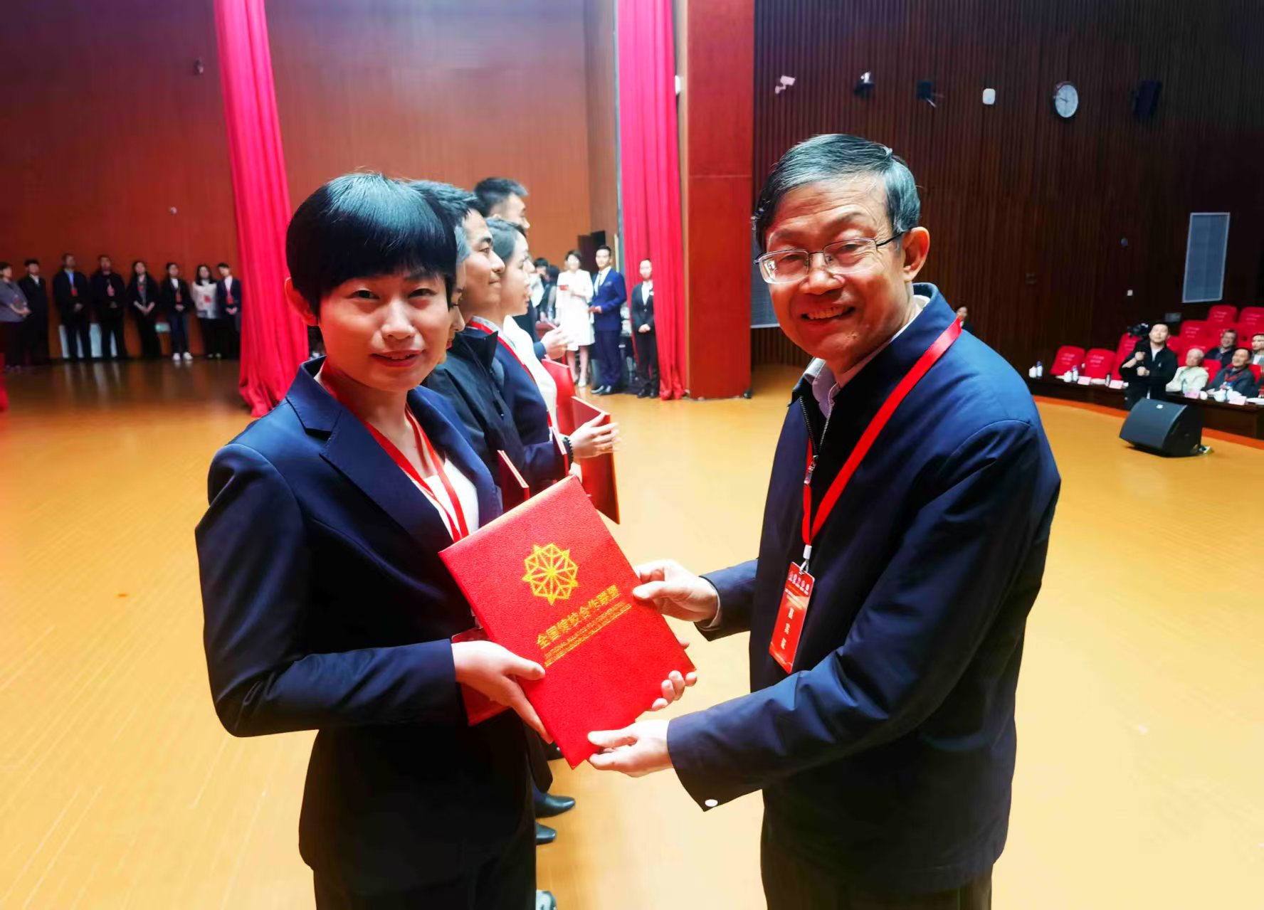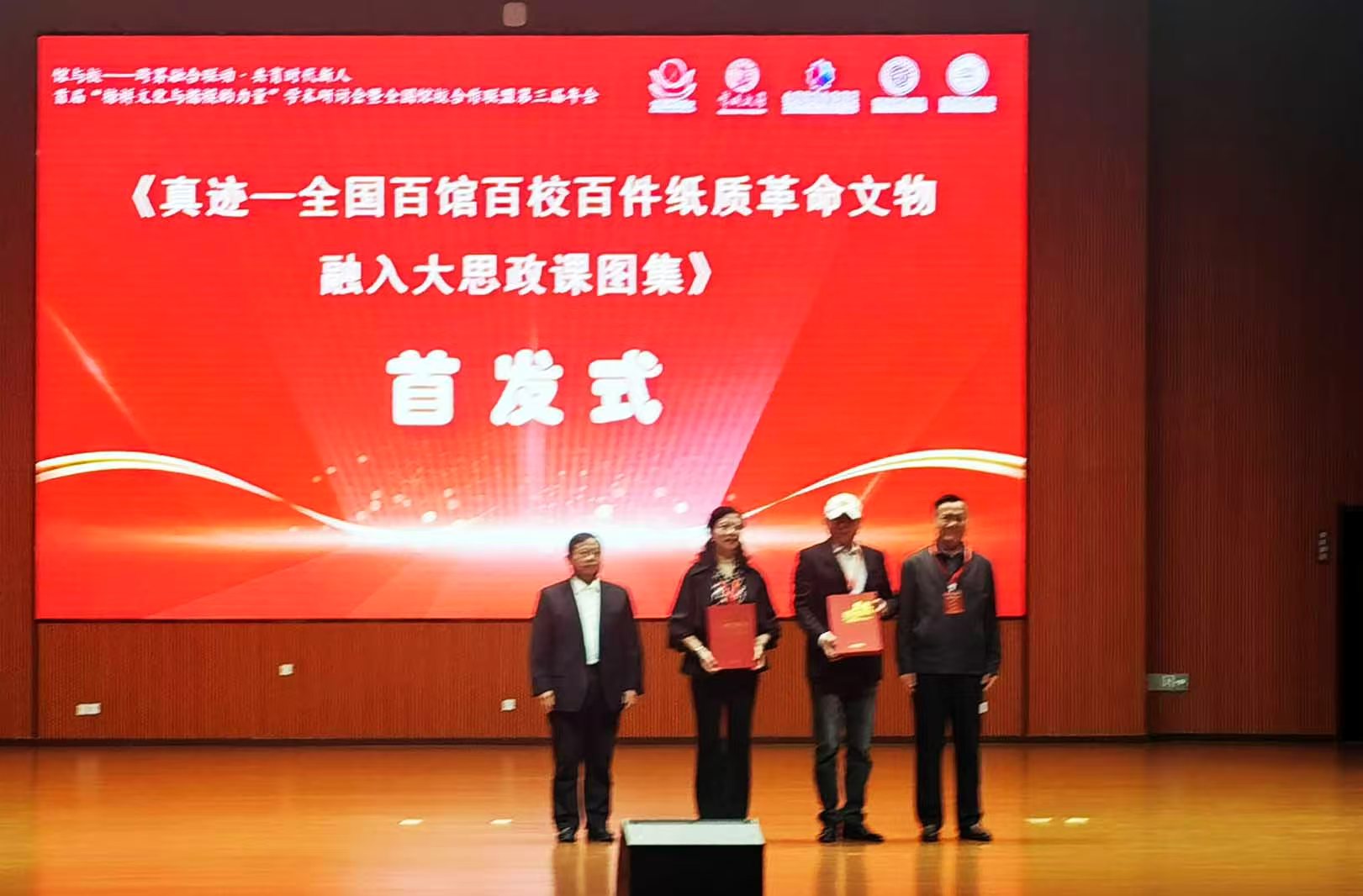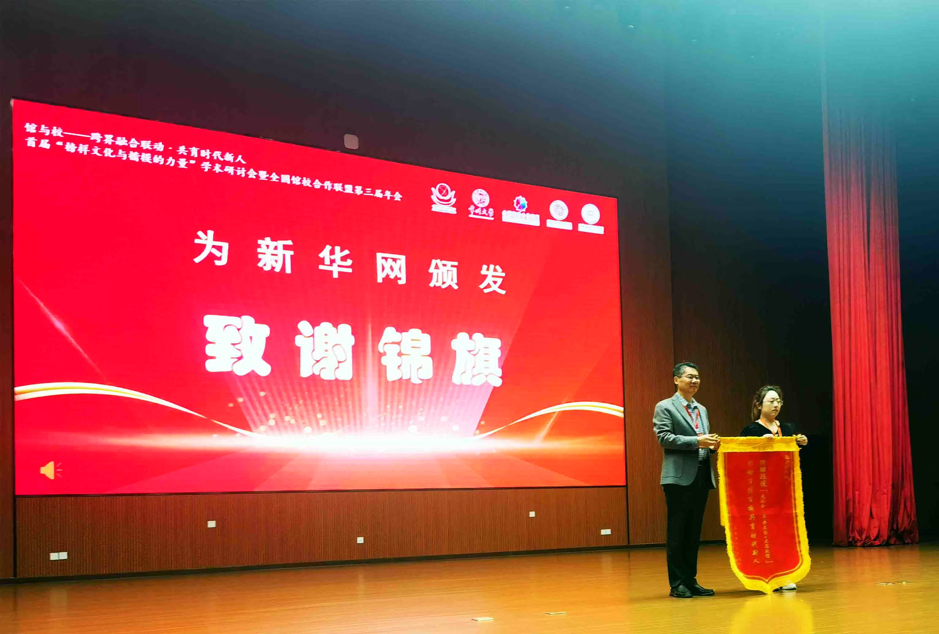 有关领导向新华网赠送锦旗。 开幕式上,发布《真迹—全国百馆百校百件纸质革命文物融入课程思政育人精选大画册》正式面世,该画册内容详实,装帧精美,百余件纸质革命文物集中展现其在新时代思想政治教育中的活化利用。发布全国馆校合作联盟会歌《同心筑荣光》后,聊城大学音乐学院60多名大学生,现场激情演唱了这首歌曲,呈现了馆校合作协同育人的使命担当。两项重要成果的发布,为馆校合作机制注入了新的文化活力。