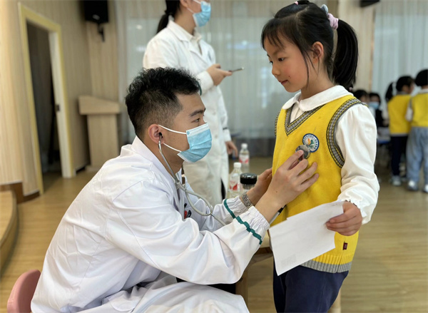 心肺听诊环节,医生为每位幼儿进行细致的检查,提醒幼儿多参与户外活动,锻炼体质的同时也能促进血管舒缩活动,增强心肺功能发展。