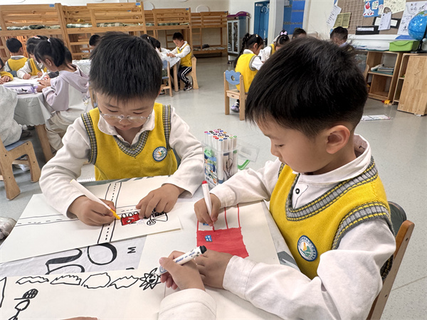 童笔绘安邦,畅想和谐未来 大班幼儿以“我心中的安全国家”为主题展开创作。画纸上不仅有蓝天绿树的生态安全,更有孩子用符号语言表达对粮食安全、生命安全和网络安全的独特理解。一幅幅童趣盎然的画作,折射出幼儿对“安全”的多维认知,既是看得见的平安家园,更是需要每个人用心守护的共同使命。