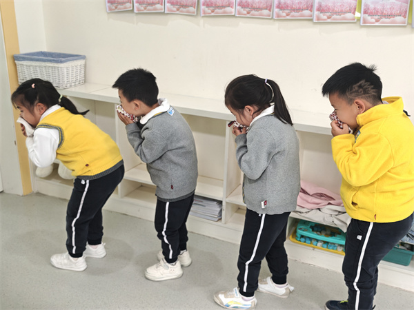 实战小演练,守护大安全 中班开展了别开生面的模拟火灾逃生演练活动。看,孩子们化身“小小消防员”,在教师的引导下,用湿毛巾捂住口鼻,弯腰沿着安全标识迅速撤离。演练不仅锻炼了孩子们的避险技能,还通过有序疏散,让孩子们体会到“秩序即生命”的重要性。演练结束后,教师组织孩子们展开讨论:“如果逃生时每个人都乱跑会怎样?”通过交流,孩子们深刻认识到个人行为与集体安全的紧密联系。