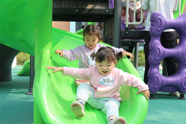 与此同时,户外的操场上也热闹非凡。彩虹伞、沙池工具等体育器械等待着小宝贝们。在老师的组织下,孩子们分组玩耍,欢笑声回荡在整个园区。