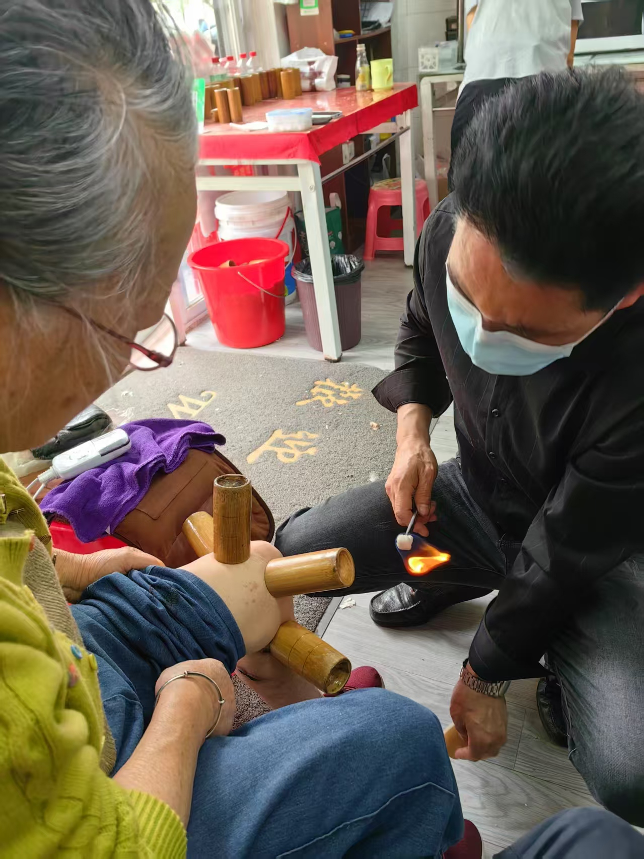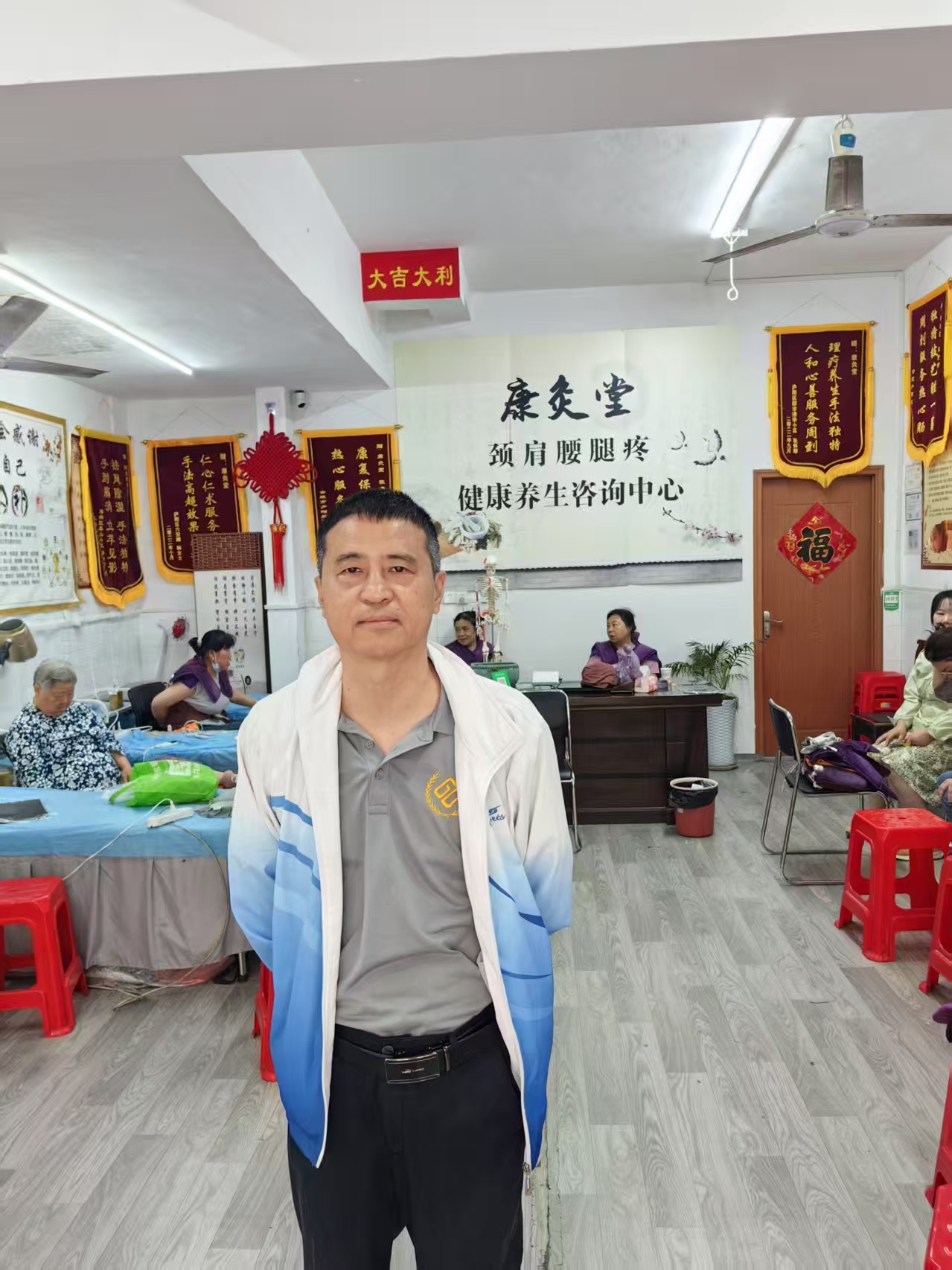 在老街边的菜市场五河路支路的沿街朝南商铺里有一间门面房,整理的很间单,干净。里面的人每天总是来来往往很多,这就是我要和大家说的康灸堂,负责人是安徽皖北人,从小跟母亲姓姓杨父亲姓张,到这里来看病的人都喜欢称呼他张医生,他今年五十五岁了,中等个子,走路如风,十五岁时就跟着中医师傅学习针灸,拔罐刮痧有四十年的时间了,对颈椎病,骨刺,腰间盘突出等骨病患者有着自己的一套独特经验和康复方法。