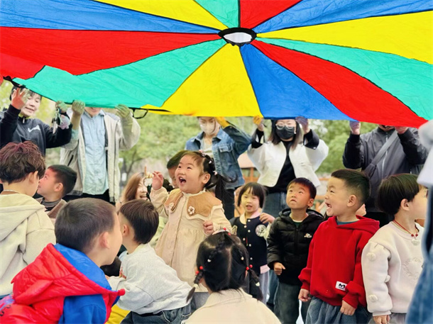 精彩纷呈的户外游戏极大地吸引了宝贝们的注意力,在家长的陪伴和老师的鼓励下,他们纷纷加入其中。彩虹伞展开,如同一朵巨大的彩色花朵,孩子们在伞下嬉笑玩耍,一会儿钻进伞下,感受彩色世界的奇妙;一会儿拉着伞边,随着老师的口令一起抖动彩虹伞,掀起层层波浪,现场充满了欢乐的笑声。情景游戏中,孩子们化身勇敢的小战士,穿越“障碍”,攀爬“高山”,在挑战自我的过程中,锻炼了身体协调能力和勇气。