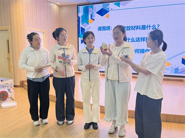 随后,各年级组教师分组展示围绕“风”设计的游戏材料。小班组以制作风力驱动小船为例,依靠风的力量吹动小船。中班组以风力车为例,利用空气的反作用力,当小汽车上面的纸杯受到风吹动时,会产生向后的推力,从而使小车向前运动。引导幼儿直接感知风能转化为动能的过程。大班组教师创设“纸杯风速仪”,通过纸杯与吸管的制作,老师手持扇子从不同距离和角度,当风吹向指示物时,指示物会沿着风向移动,同时投放不同层次的材料,如塑料袋、纸巾,满足个体差异。