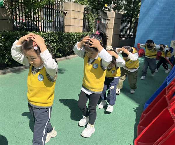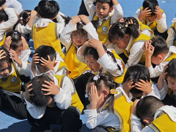 第二声警报响起时,孩子们迅速弯腰、护头,在老师的带领下,沿着指定逃离路线,快速有序撤离到户外操场空余场地。整个过程不推挤、不拉扯、不慌张,保持步伐稳定,冷静而迅速。
