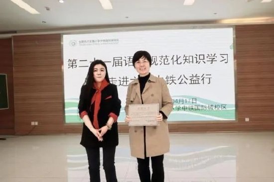 2025年4月17日上午10点,第二十一届全国语文规范化知识学习活动公益行走进了六安路小学中铁国际城校区。活动由教育部、国家语委指导,中国教育学会、中国语文报刊协会等七家机构联合主办,通过捐书仪式、文化宣讲、互动答题等形式,推广国家通用语言文字,弘扬中华优秀传统文化,为青少年厚植文化根基。第21届语文规范化知识活动安徽地区负责人汪漫女士代表捐助方向六小中铁党总支副书记邓翠银递交了“捐助名册”。此次捐赠的书籍以语文规范化知识读本为核心,涵盖经典文学、汉字解析等内容,既充实了学校图书资源,也为学生打开了探索语言文化的窗口。学校借此机会将这批书籍用于建设班级图书角,助力学生日常学习,成为学生探索语言文化的“指南针”。