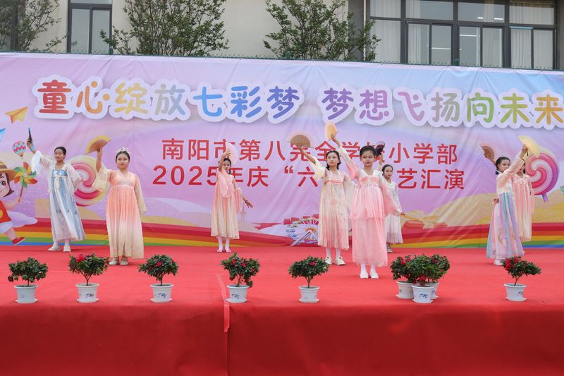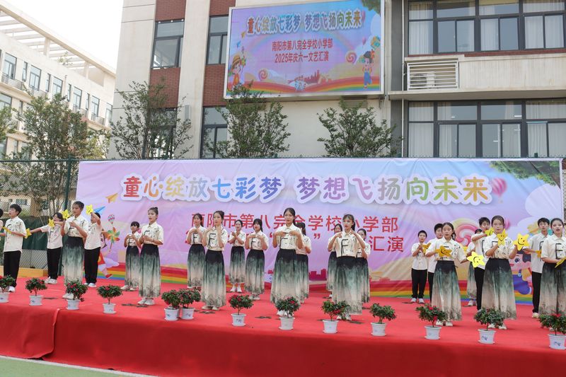 童心绽放七彩梦 梦想飞扬向未来——南阳市第八完全学校小学部开展2025年庆“六一”文艺汇演活动六月,阳光灿烂,充满童趣;六月,微风轻拂,梦想绽放。在这美好的时节,南阳市第八完全学校小学部于2025年5月28日上午,举办了 “童心绽放七彩梦 梦想飞扬向未来” 庆“六一”文艺汇演活动。 全校师生与受邀嘉宾、家长们齐聚一堂,共同见证这场童真与梦想交织的盛宴。为呈现这场精彩的文艺汇演,师生们早早就投入了紧张的筹备工作。从舞台背景的设计到表演道具的制作,从节目流程的编排到服装细节的调整,每一个环节都凝聚着大家的心血。 活动伊始,胡校长发表致辞。他目光温暖地望向台下的孩子们,用亲切的话语回顾了同学们过去一年的成长与进步,鼓励大家在属于自己的节日里勇敢展示才华,并祝愿每一个孩子都能在童真的舞台上绽放最耀眼的光芒。刘太营社区张飞书记、白河中心校雷恒怀主任也依次致辞,为本次汇演活动拉开了序幕。他们的话语中既有对学校素质教育成果的肯定,也有对孩子们未来的殷切期望,台下不时响起热烈的掌声,将活动氛围推向小高潮。 舞台上,孩子们动作整齐有力,舞步轻盈欢快。无论是传统服饰的韵味还是现代表演的活力,都展现出新时代少年的蓬勃朝气与豪迈风采。孩子们身着鲜艳的服装,有的蹦跳着挥舞花球,有的踮脚旋转露出灿烂笑容。背景的彩色气球与主题横幅交相辉映,每一个灵动的身影都像一支画笔,在“六一”的画卷上添上了最童真的色彩。参与花样跳绳表演的孩子们灵动跳跃,绳影闪烁,展现出蓬勃的朝气与活力。校级节目《有我》为我们展现出担当奉献、勇于拼搏的精神。最后,汇演在合唱《再见》中落下帷幕,歌声中饱含着对童年时光的不舍与对未来的憧憬。这场持续数小时的盛会不仅是一次才艺展示,更像一颗种子,将“勇敢逐梦”的信念悄悄种进了每个孩子的心田。