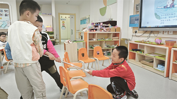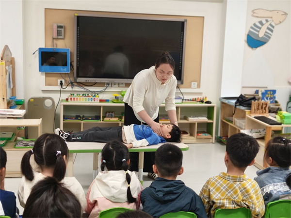 中班教师组织幼儿通过“情景模拟+趣味互动”巩固加强“野外水域危险”“同伴溺水如何求救”等场景的施救知识,引导幼儿直观感受溺水风险、理解科学施救,在实践中提升应急能力。