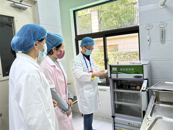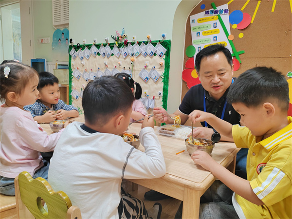 随后,谢督学通过查阅资料、现场提问等方式,对学校主体责任落实情况、制度建立落实情况、食品安全落实情况等方面进行全面督查。检查结束后,谢督学走进班级进行陪餐,他仔细观察孩子们用餐过程,确认餐品温度适宜、营养均衡、分量合理,期间还不时提醒幼儿 “嚼嚼碎,慢慢咽”。