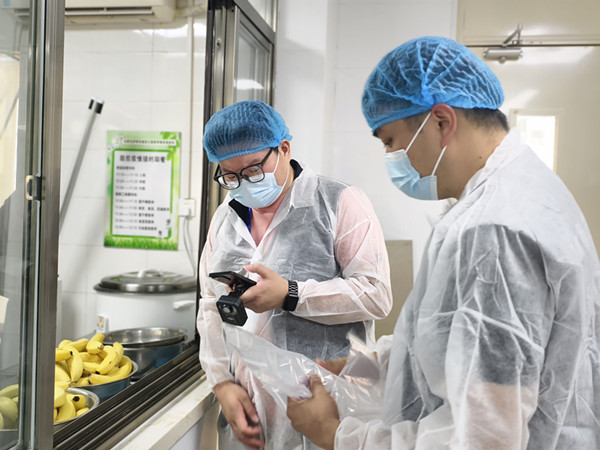 抽检人员首先对幼儿园食品经营许可证、从业人员的健康证以及食品供货方资质材料等进行核验。随后进入食堂,询问当日进货情况,对当天食材进行现场取样称重、包装、密封打包,将其带回进一步进行检测。食品抽检封存后,抽检人员对海棠园幼儿餐用具进行现场的检测,采样全程实时录像,严密且精细,工作人员认真负责、一丝不苟,确保了抽检质量。