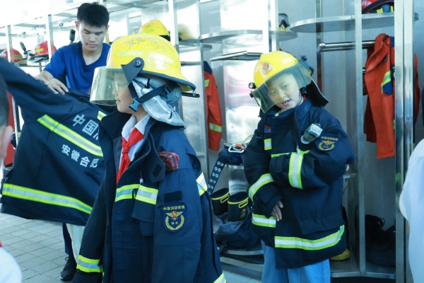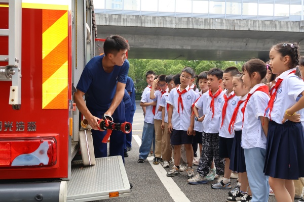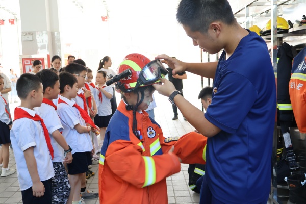 在消防员叔叔的热情带领下,队员们首先来到消防装备区。各类消防工具整齐排列,像等待检阅的 “兵器”。消防员拿起液压扩张器演示:“这是‘大力士’,能把变形的门窗撑开,救出被困人员。” 他还讲解了水带、分水器等装备的功能和使用方法。最让队员们期待的是试穿消防服,当厚重的战斗服、沉甸甸的头盔穿戴在身上,大家瞬间感受到消防员执行任务时的闷热与负重。“原来叔叔们每次出警都要扛着这么重的装备,太辛苦了!” 一位队员擦着额头的汗说,这让他们对消防工作的认知更深刻了。