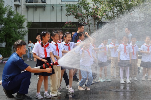 活动尾声,队员们捧着电解质水,恭敬地递给消防员:“叔叔,夏天很热,您执勤辛苦了,喝点水吧!” 稚嫩的声音里满是真诚。消防员们接过水,脸上露出欣慰的笑容,轻轻摸了摸孩子们的头。这份夏日清凉,传递着队员们的关怀,也让他们学会了用行动表达感恩,深化了 “致敬” 主题。