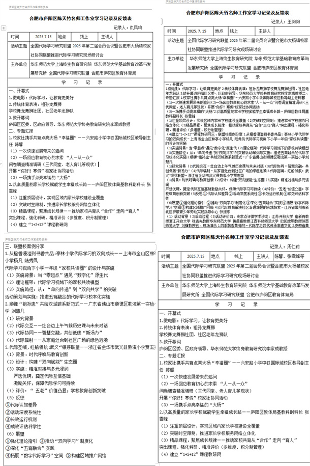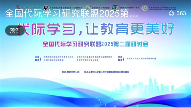 合肥市双岗幼儿园教育集团:云端研学,聚力成长 ——庐阳区陈天竹名师工作室线上共探代际学习与校家社协同之道在数字化时代的浪潮下,知识的传递与交流打破了时空的界限。2025年7月15日,庐阳区陈天竹名师工作室的成员们齐聚线上,共同参与了全国代际学习研究联盟2025年第二届研讨会暨合肥市大杨镇校家社协同联盟推进代际学习研究现场研讨会。本次会议由华东师范大学上海终生教育研究院、华东师范大学基础教育改革与发展研究所、全国代际学习研究联盟以及合肥市庐阳区教育体育局联合主办,合肥市六安路小学中铁国际城校区承办,为工作室成员带来了一场知识的盛宴。