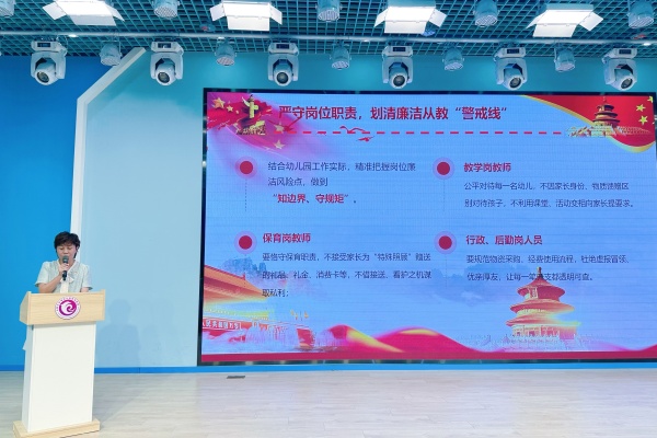 紧接着各部门负责分别从党建引领、教育教学、后勤保障等方面,全面总结了上一阶段工作,并详细部署了新学期的具体计划,让全体教职工明确了各岗位的工作方向与协作重点,为后续工作的高效推进奠定了基础。 深化廉政教育 筑牢思想防线 廉洁从教是幼教工作的底线,师德师风是教师队伍的灵魂。会议中,吴园长开展了廉洁教育培训,培训中,吴园长围绕“坚守育人初心,“筑牢廉洁思想‘防火墙’”“严守岗位职责,划清廉洁从教‘警戒线’”两大主题,结合幼教工作实际,剖析岗位廉洁风险点,明确教学、保育、行政后勤等不同岗位廉洁从教要求,此次培训使全体教师深刻认识到廉洁从教的重要性。在日常活动中时刻保持清醒的头脑,严格遵守教师职业道德规范。