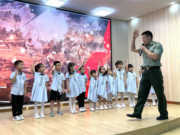 今年正值抗战胜利80周年,红玺台总园特邀退伍军人家长讲述革命故事,在孩子心中播下爱国种子。中班幼儿献上自制的“爱心感谢卡”,表达对英雄的崇敬。更令人惊喜的是“国防小课堂”——三名大班幼儿化身“国防小讲师”,用稚嫩而坚定的声音介绍辽宁舰、运20等大国重器,展现新时代幼儿的科技梦想与家国情怀。各班“小小兵”代表佩戴闪亮勋章,在《红星闪闪》的音乐中大家一同舞蹈,传递着孩子们立志成长、报效祖国的决心。
